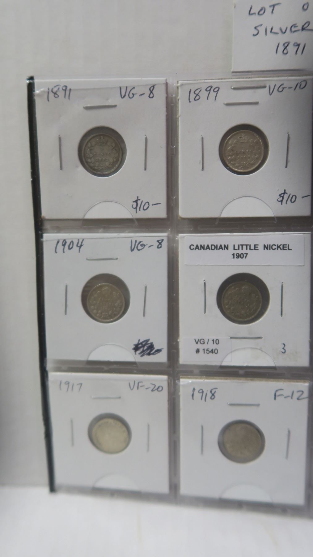 Lot of 12 Canadian Silver 5 Cents 1891 – 1920. Includes 1891, 1899, 1902, 1903H Small H, 1904, 1907, 1912, 1913, 1917, 1918, 1919 & 1920. Coins grade VG-8 to VF-20. A nice selection.