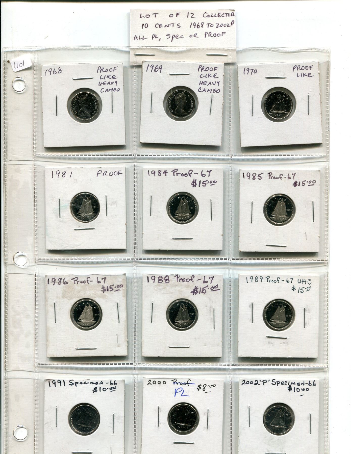 Lot of 12 Collector 10 Cents 1968 to 2002P. Includes 1968, 1969, 1970, 1981, 1984, 1985, 1986, 1988, 1989, 1991, 2000 & 2002P. All coins Proof Like (some with Heavy Cameos), Specimen or Proof with Ultra Heavy Cameos. A nice selection.