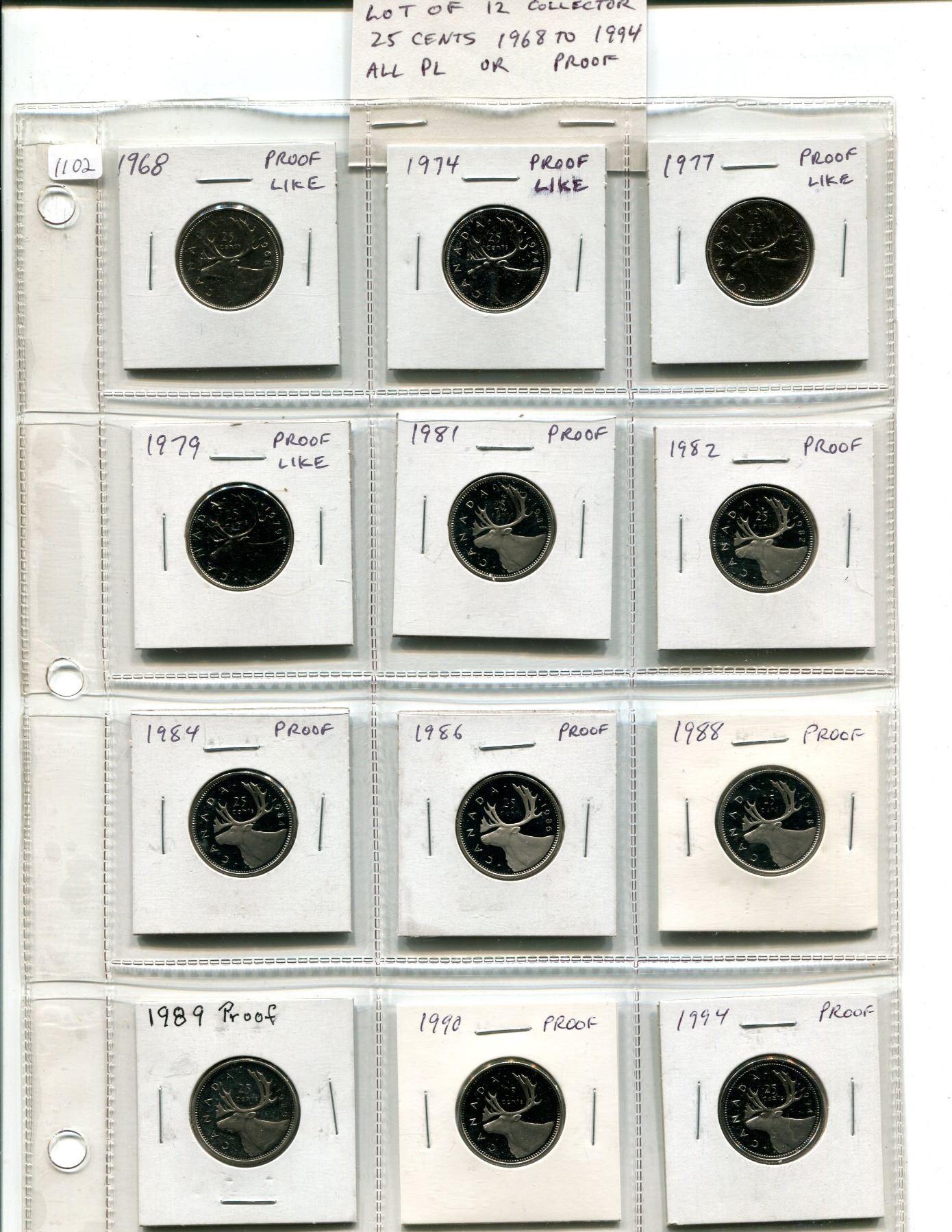 Lot of 12 Collector 25 Cents 1968 to 1994. Includes 1968, 1974, 1977, 1979, 1981, 1982, 1984, 1986, 1988, 1989, 1990 & 1994. All coins Proof Like or Proof with Ultra Heavy Cameos. A nice selection.