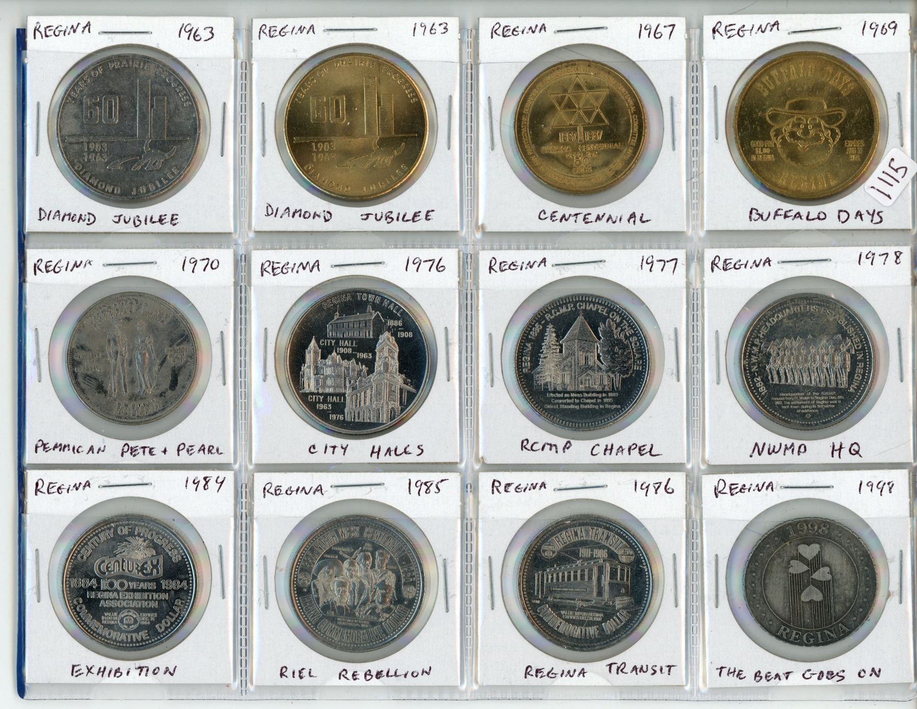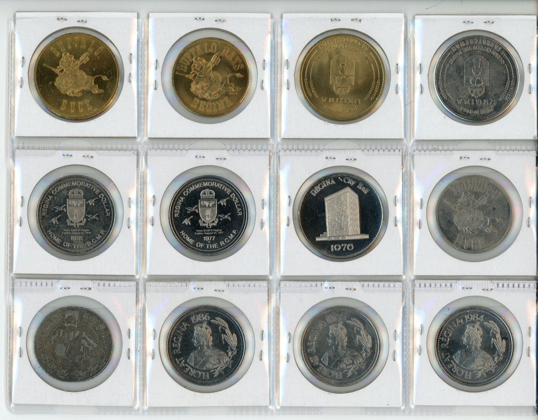 Lot of 12 Regina Medals & Trade Dollars. Includes Diamond Jubilee, Centennial, Buffalo Days, Pemmican Pete & Pearl, City Halls, RCMP Chapel, NWMP HQ, Regina Exhibition, Riel Rebellion, Regina Transit & The Beat Goes On. Uncirculated.