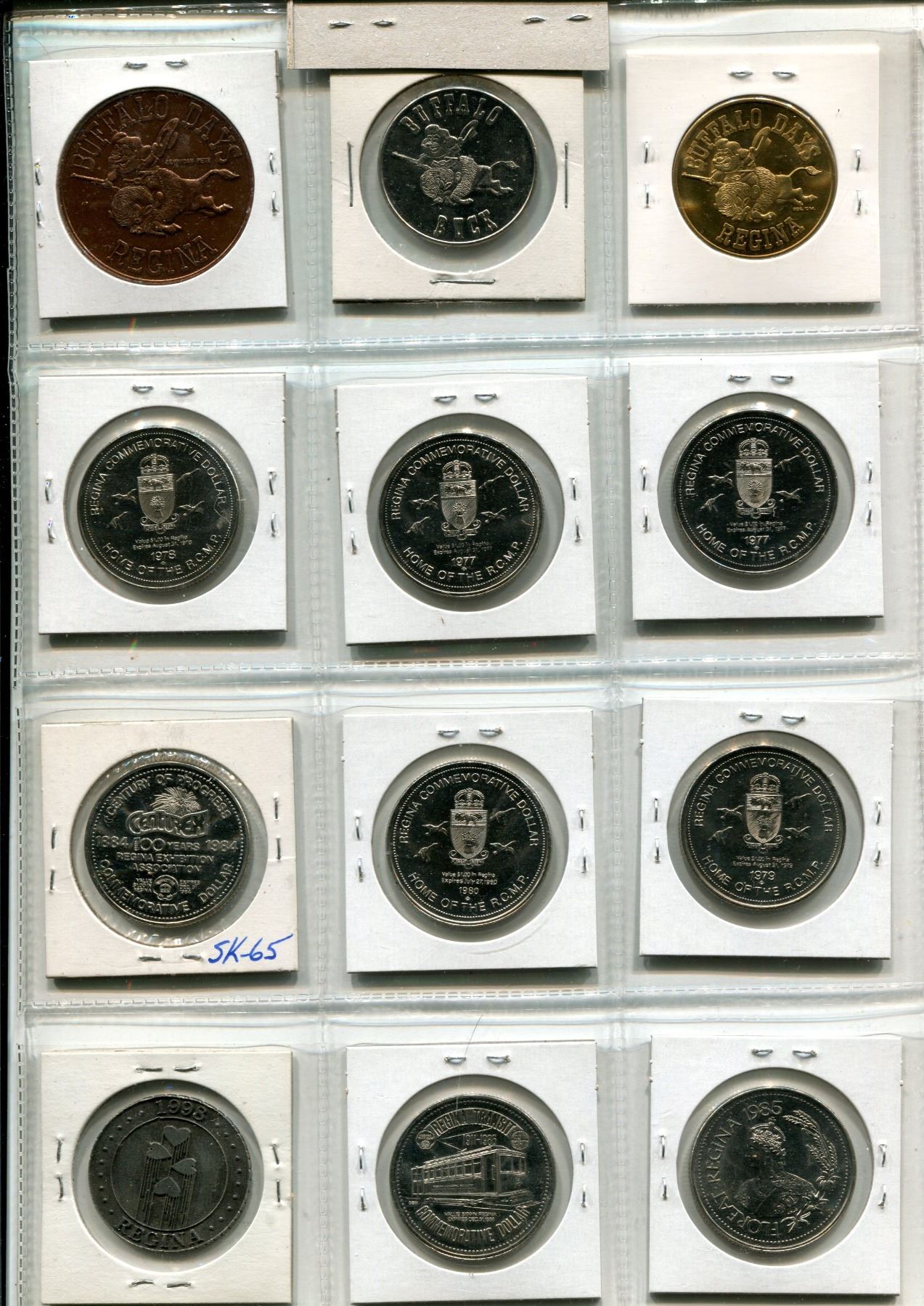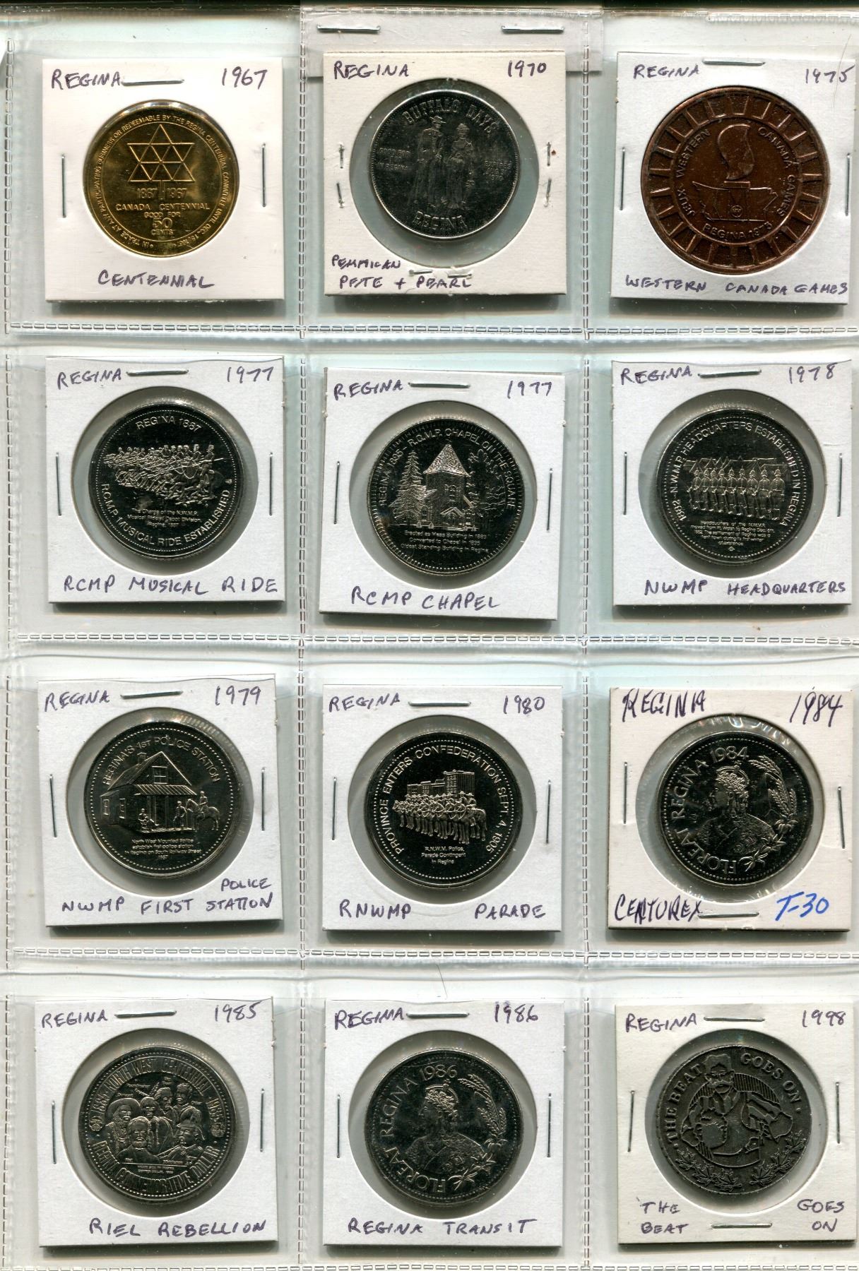 Lot of 12 Regina Trade Dollars & Medals. Includes 1967 Centennial, Pemmican Pete & Pearl, Western Canada Games, RCMP Musical Ride, RCMP Chapel, NWMP HQ, NWMP First Police Station RNWMP Parade, Centurex, Riel Rebellion, Regina Transit & The Beat Goes On. Uncirculated.
