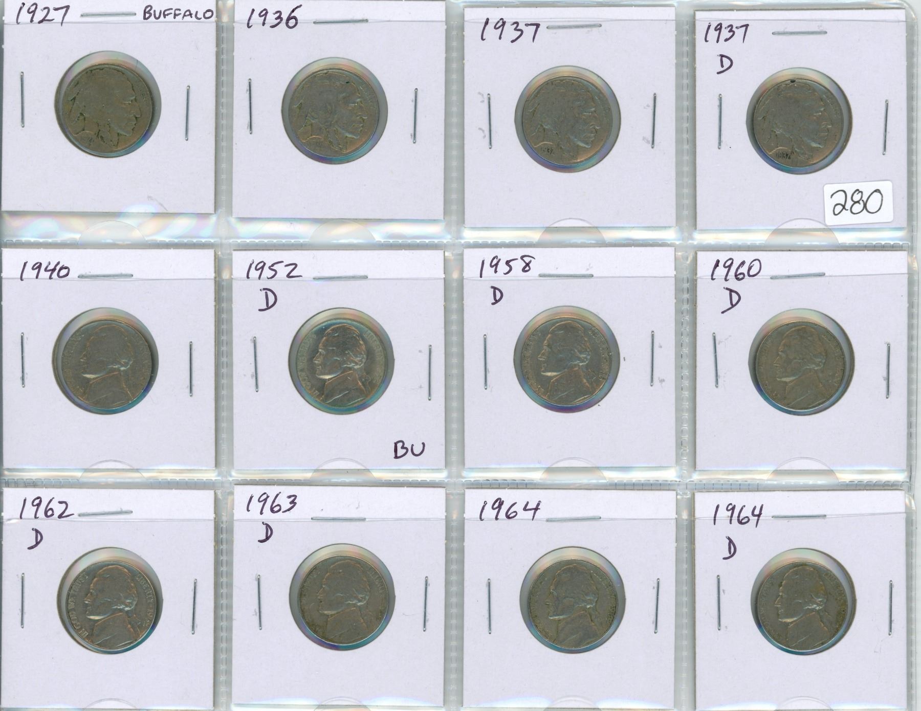 Lot of 12 U.S. Buffalo & Jefferson Nickels. Includes 1927, 1936, 1937, 1937D, 1940, 1952D, 1958D, 1960D, 1962D, 1963D, 1964 & 1964D.
