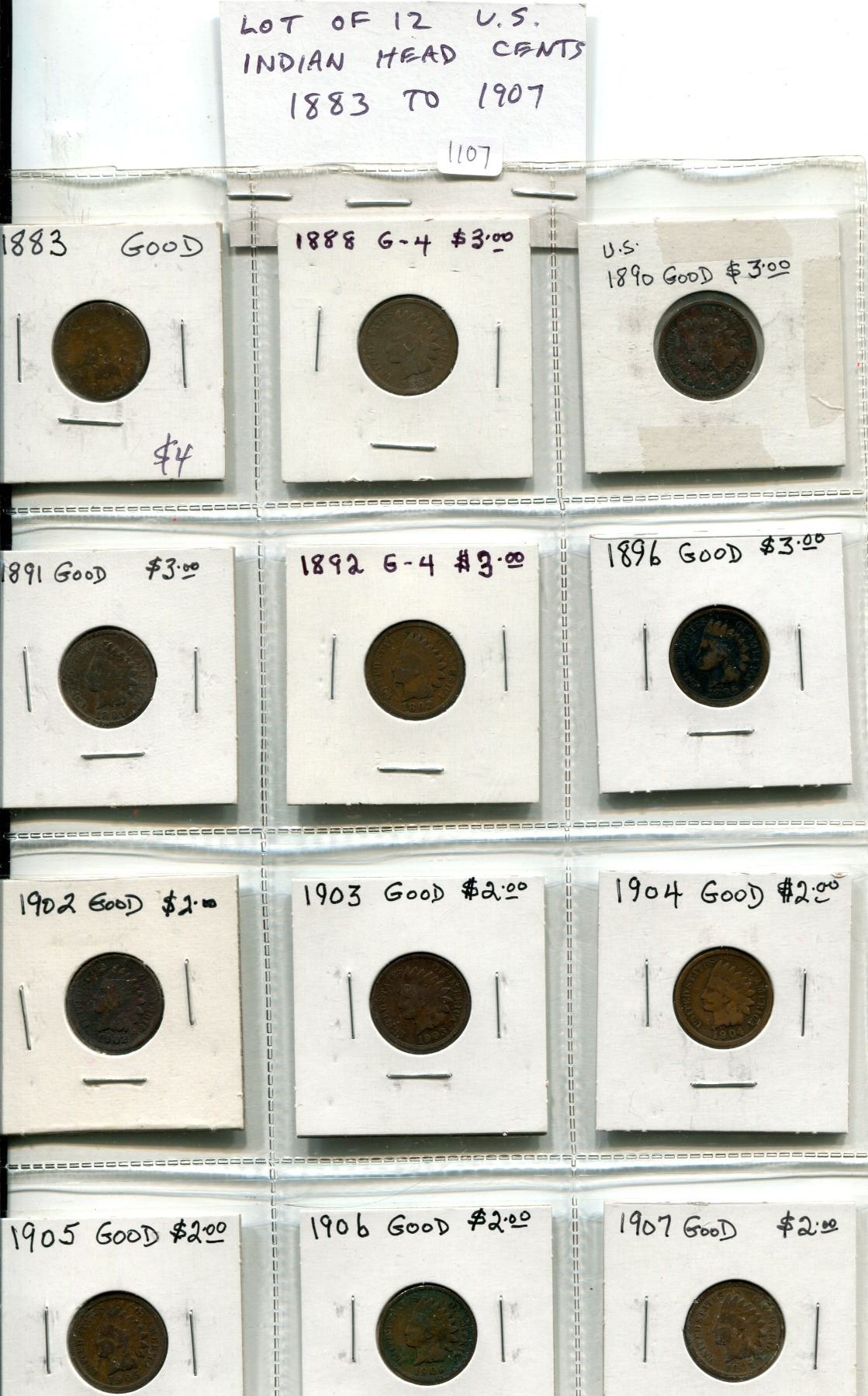 Lot of 12 U.S. Indian Head Cents 1883 to 1907. Includes 1883, 1888, 1890, 1891, 1892, 1896, 1902, 1903, 1904, 1905, 1906 & 1907. Coins grade Good.