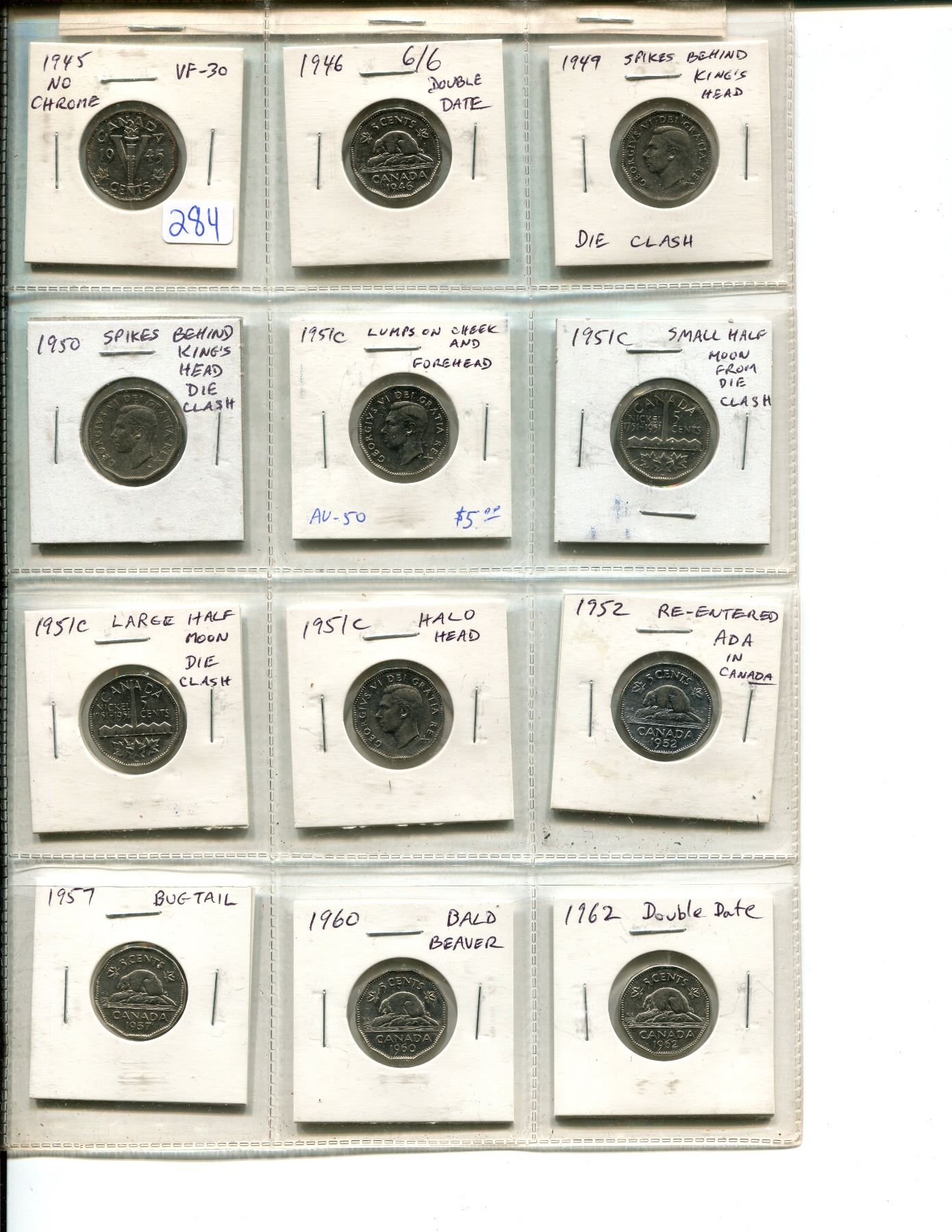 Lot of 12 different Canadian Errors and Varieties. All are nickel 5 cents from 1945 to 1962. Includes No Chrome, Doubled Dates, Die Clashes, Lumps, Half Moons, Halo Head, Re-Entered, Bug Tail & Bald Beaver. Nice.