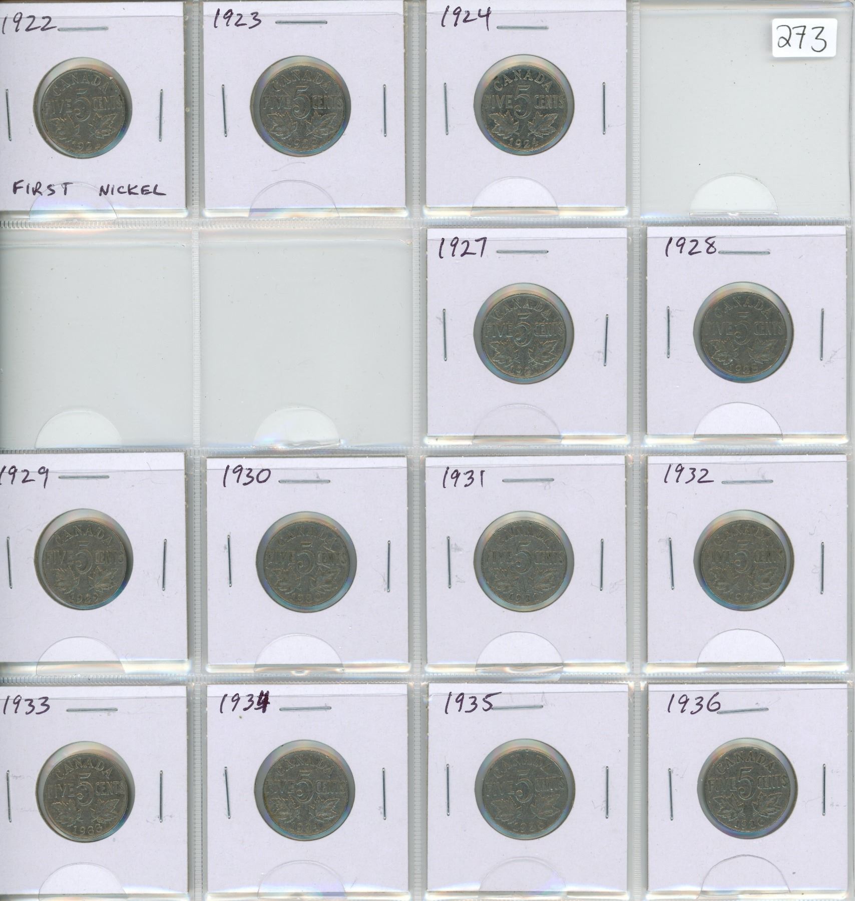 Lot of 13 Canadian King George V Nickel 5 Cents. Includes 1922, 1923, 1924, 1927, 1928, 1929, 1930, 1931, 1932, 1933, 1934, 1935 & 1936. Missing only the Key Dates. Coins grade VG-8 to F-15.