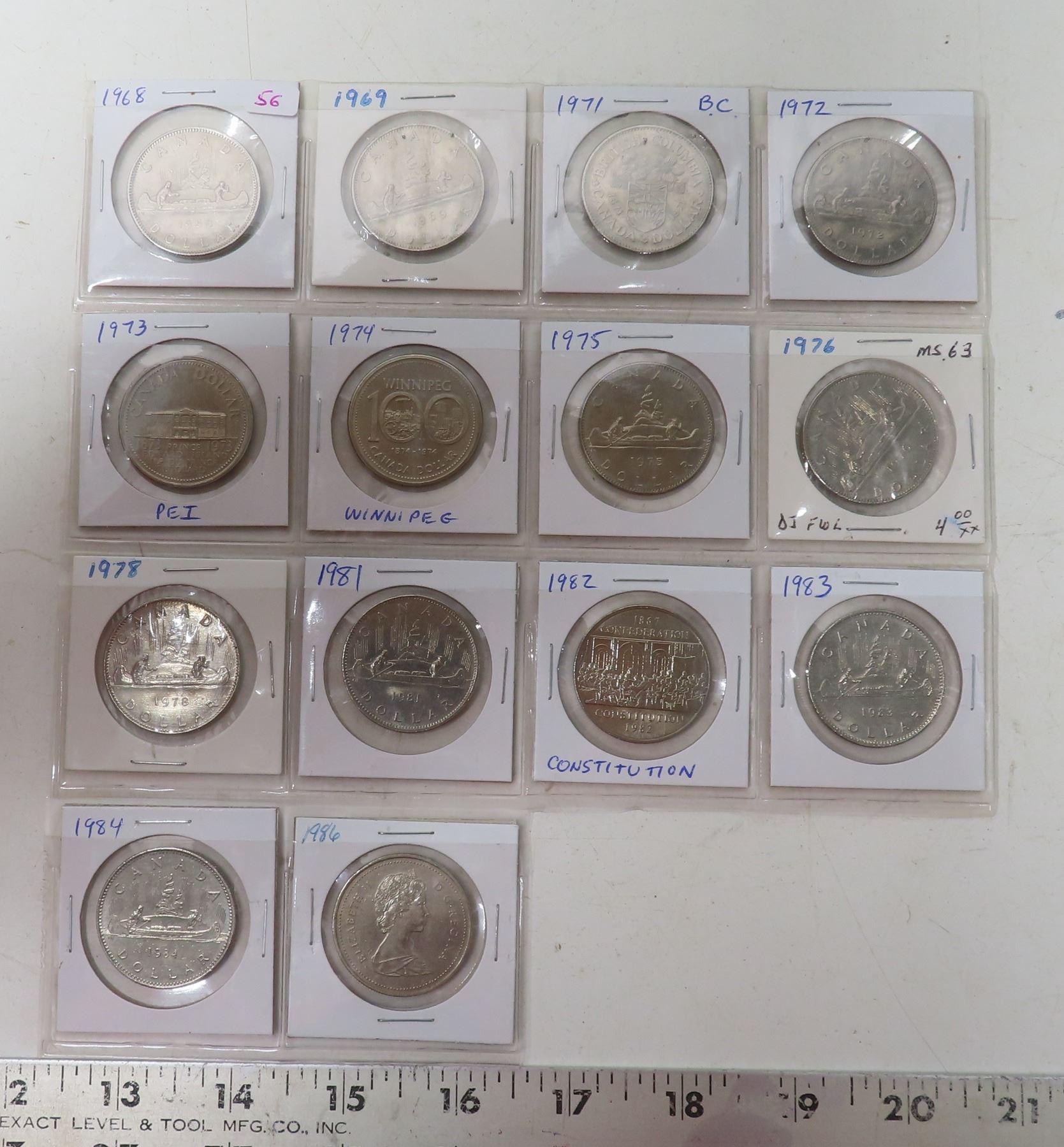 Lot of 14 Canadian Nickel Dollars. Includes 1968, 1969, 1971 BC, 1972, 1973 PEI, 1974 Winnipeg, 1975, 1976 FWL, 1978, 1981, 1982 Constitution, 1983, 1984 & 1986. Coins grade up to MS-63.