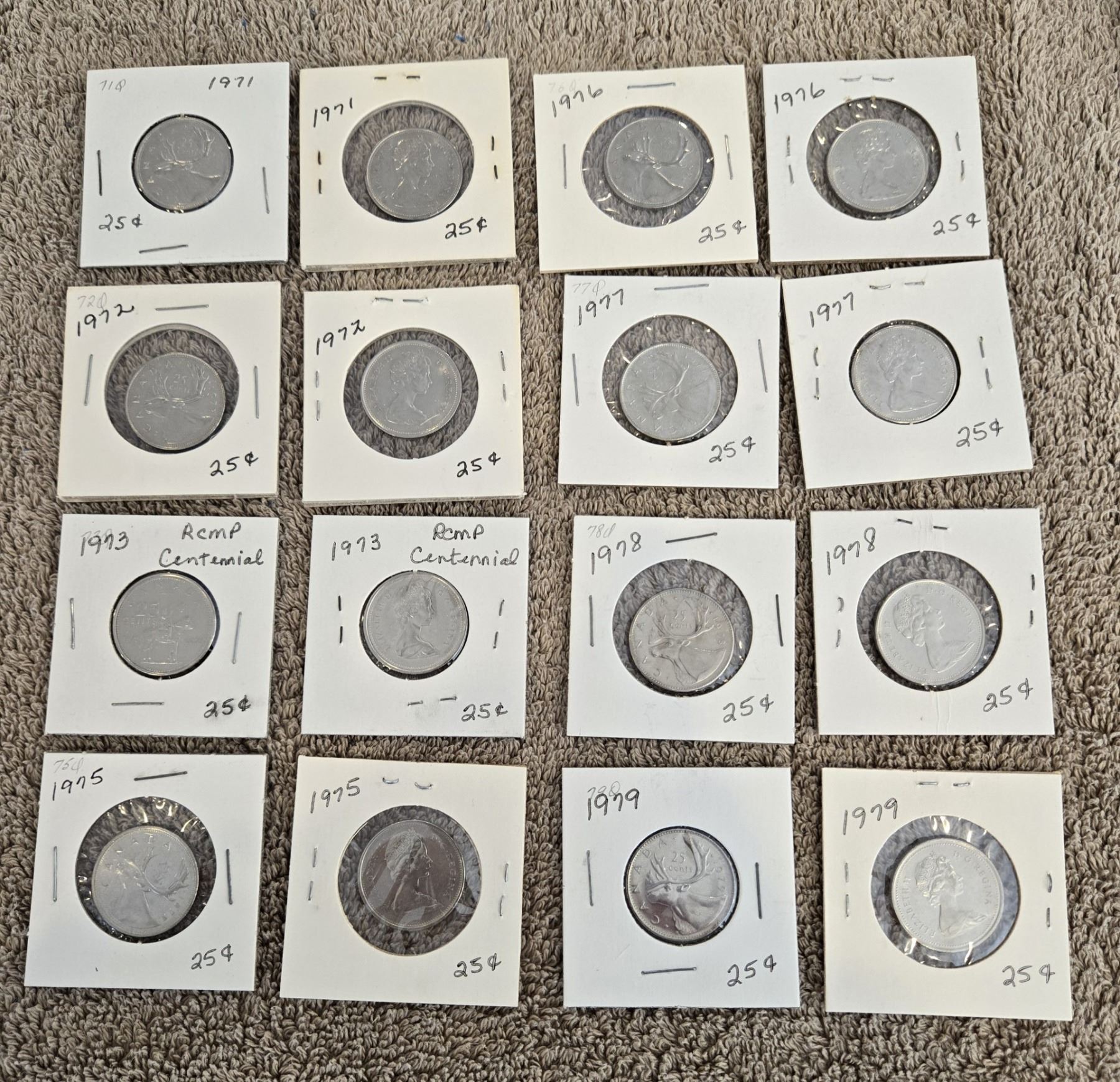 Lot of 16 Canada quarters. 1971-1973, 1975-1979. 2 coins per year