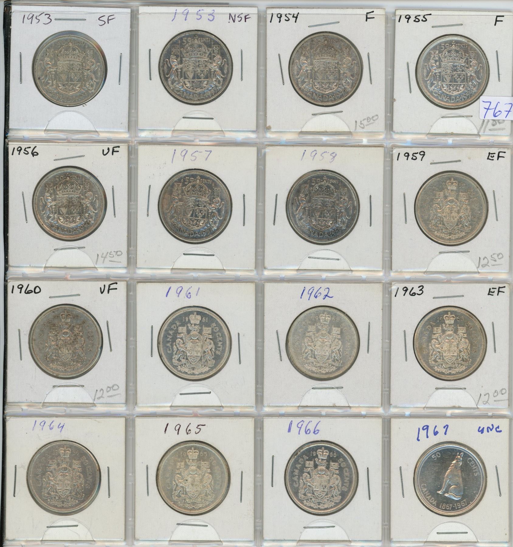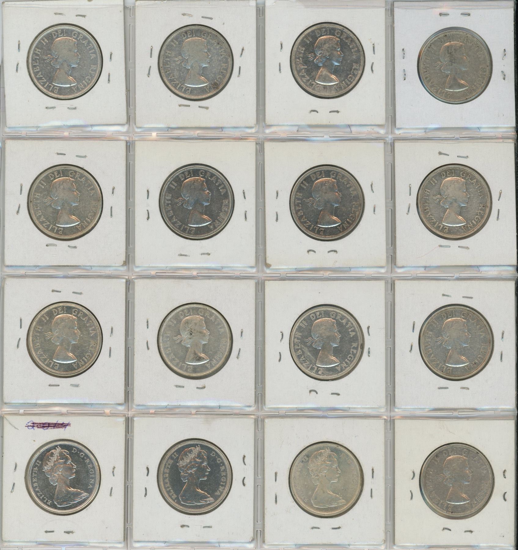 Lot of 16 Canadian Elizabeth Silver 50 Cents. Includes 1953 SF, 1953 NSF, 1954, 1955, 1956, 1957, 1958, 1959, 1960, 1961, 1962, 1963, 1964, 1965, 1966, & 1967. Coins grade Fine to Uncirculated. A nice selection.
