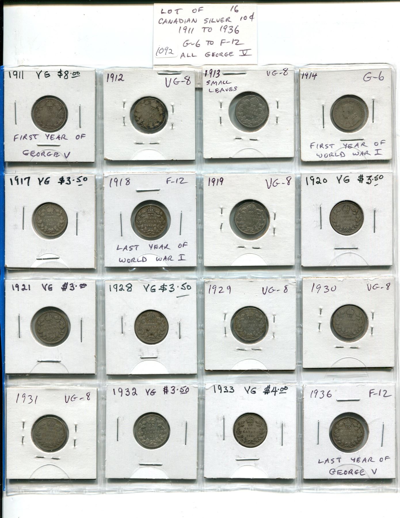 Lot of 16 Canadian George V Silver 10 Cents. Includes 1911, 1912, 1913 Small Leaves, 1914, 1917, 1918, 1919, 1920, 1921, 1928, 1929, 1930, 1931, 1932, 1933 & 1936. Coins grade G-6 to F-12.