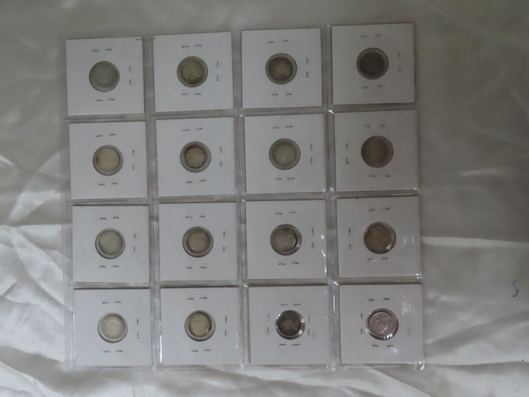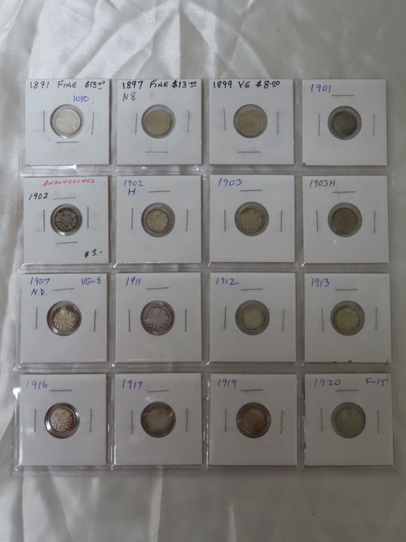 Lot of 16 Canadian Silver 5 Cents. Includes 1891, 1897 Narrow 8, 1899, 1901, 1902, 1902H, 1903, 1903H, 1907 Narrow Date, 1911, 1912, 1913, 1916, 1917, 1918, 1919 & 1920. Coins grade from VG-8 to F-15.