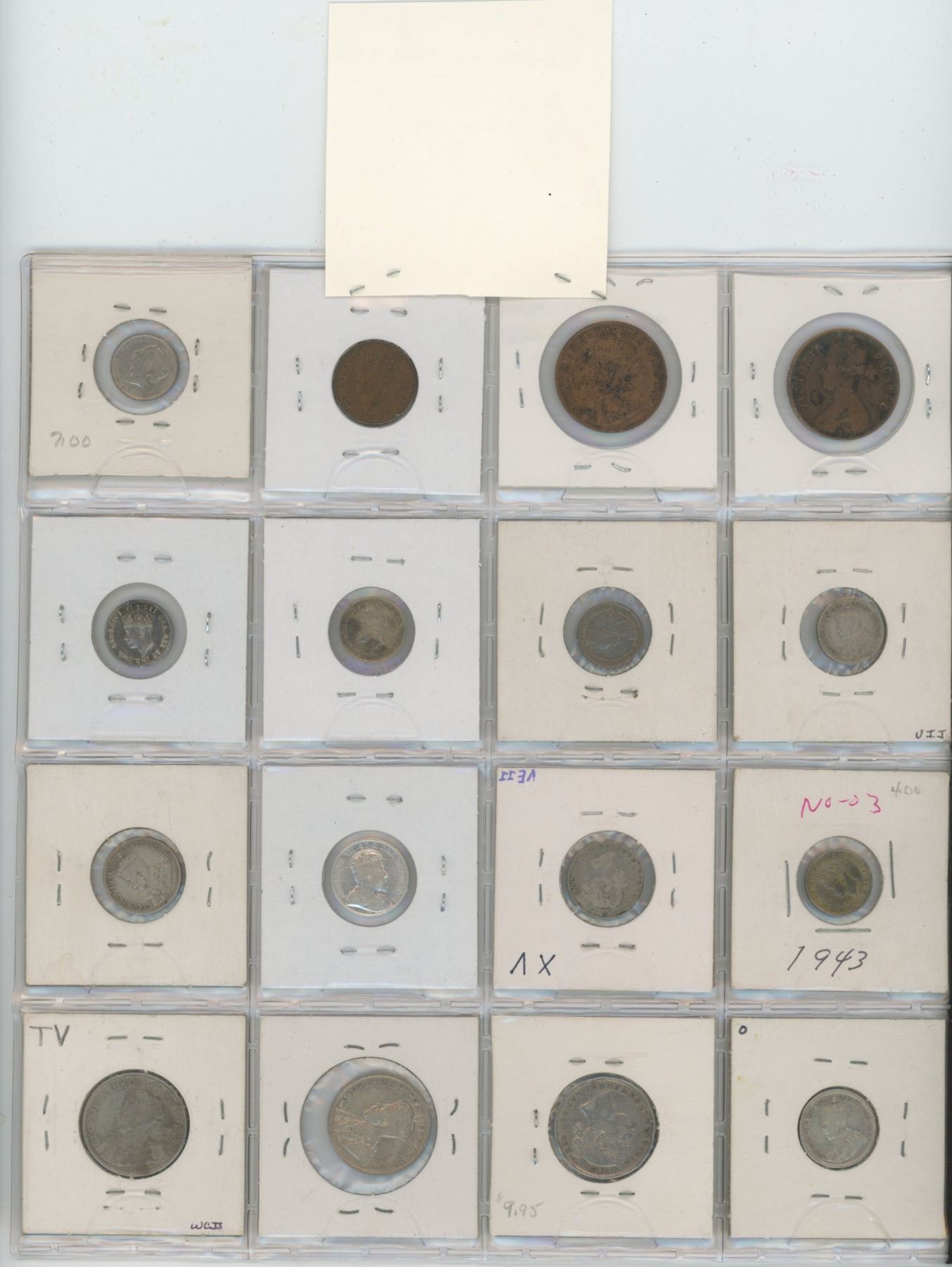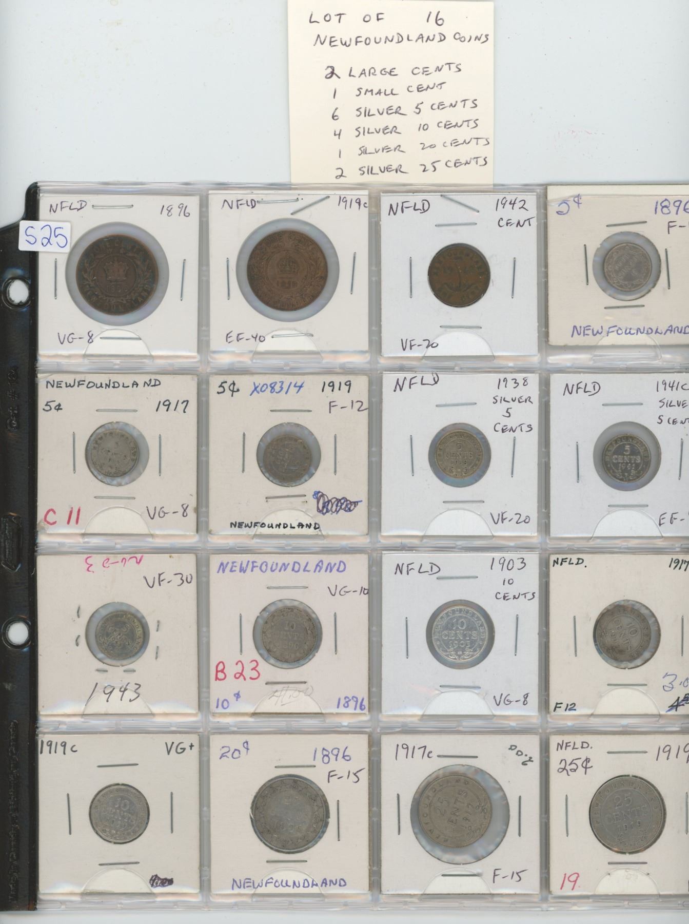 Lot of 16 Newfoundland coins:1896 1c VG-8; 1919c 1c EF-40; 1942 1c VF-20; 1896 5c F-12; 1917c 5c VG-8; 1919c 5c F-12; 1938 5c VF-20; 1941c 5c EF-40; 1943c 5c VF-30; 1896 10c VG-10; 1903 10c VG-8; 1917c 10c F-12; 1919c 10c VG-10; 1896 20c F-15; 1917c F-15; 1919c 25c F-12.