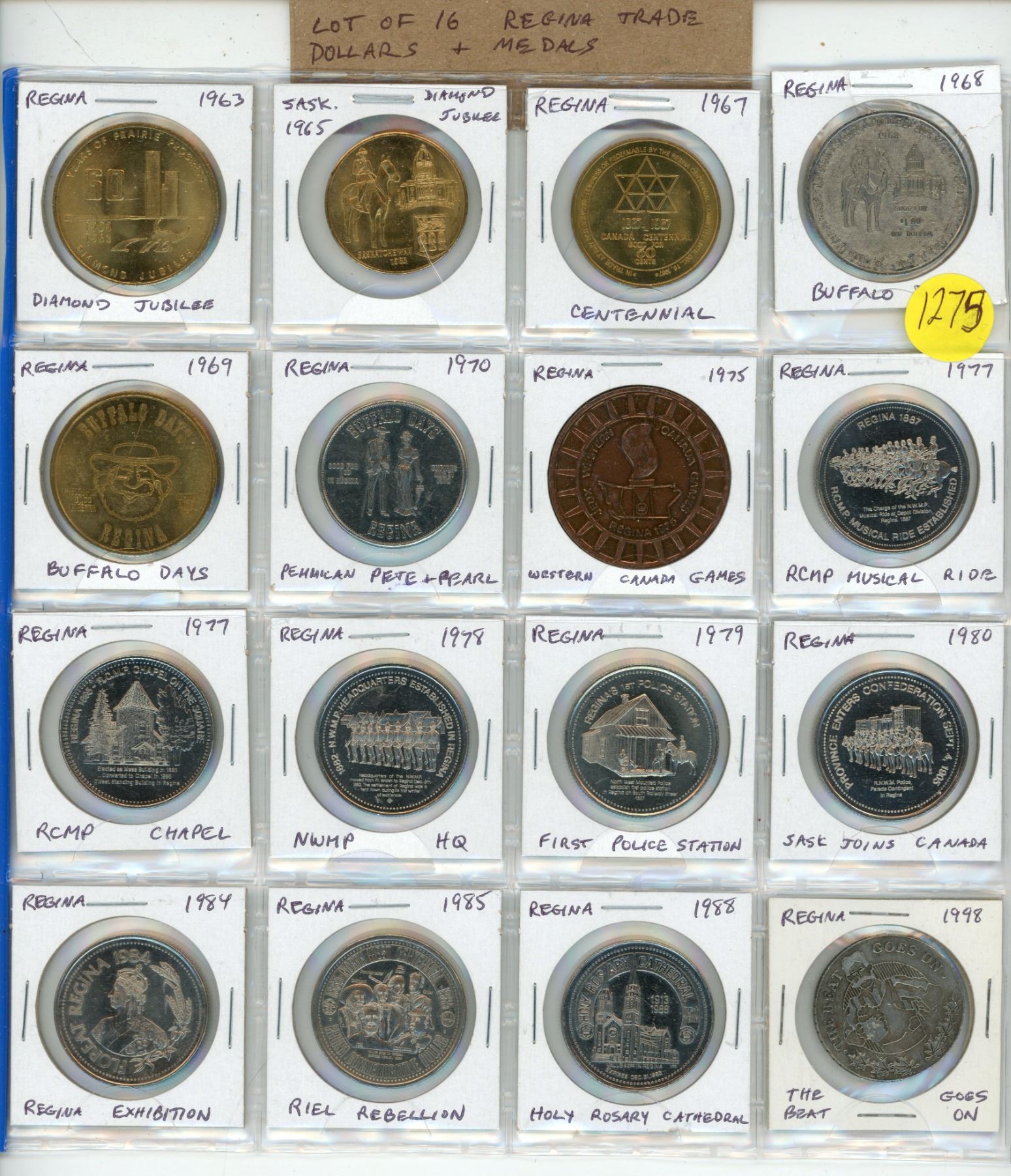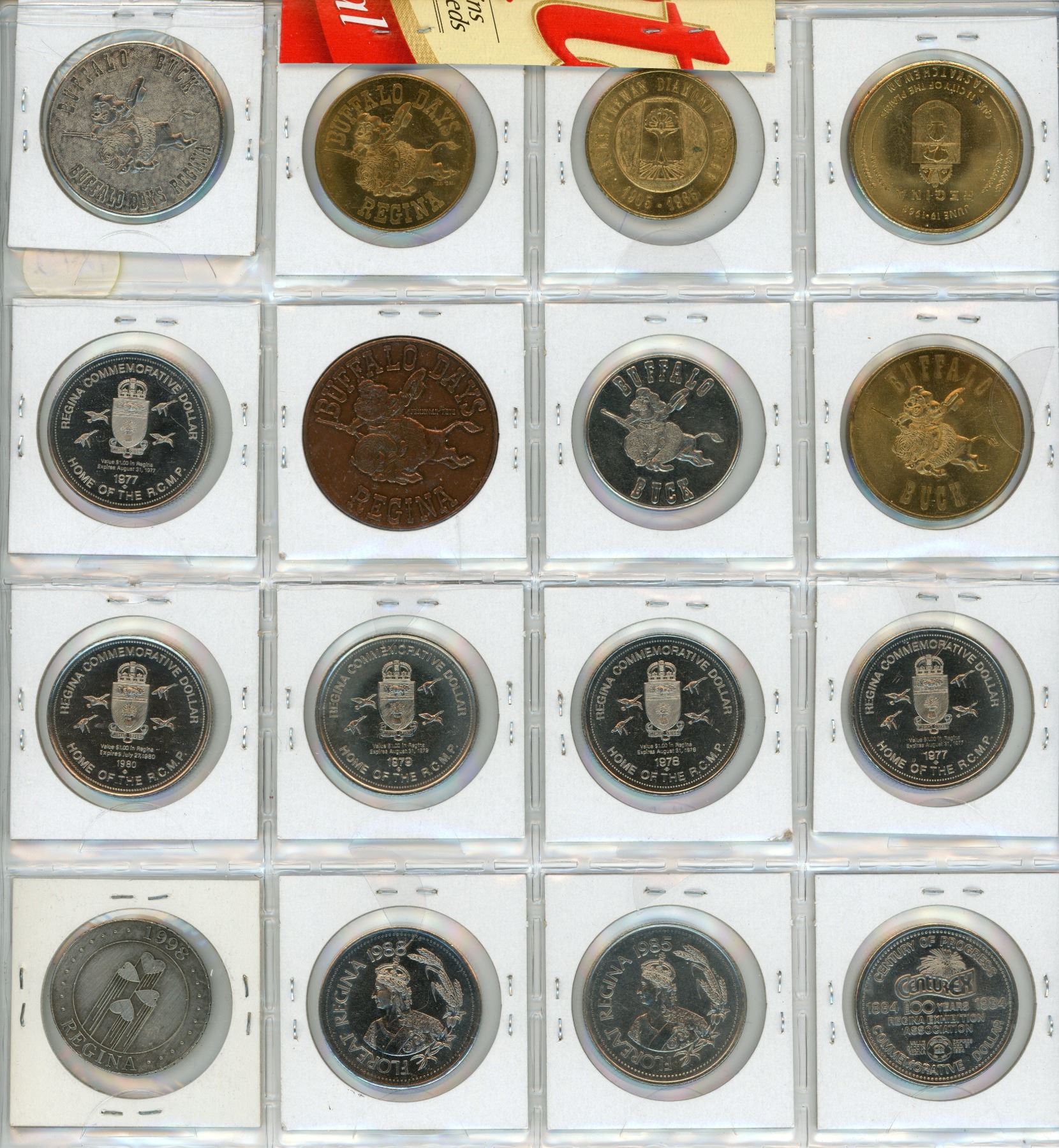 Lot of 16 Regina Trade Dollars & Medals. Includes 1963 Diamond Jubilee, 1965 Diamond Jubilee, 1967 Centennial, 1968 Buffalo Days, 1969 Buffalo Days, 1970 Pemmican Pete & Pearl, 1975 Western Canada Games, 1977 RCMP Musical Ride, 1977 RCMP Chapel, 1978 NWMP HQ, 1979 First Police Station, 1980 Sask. Joins Canada, 1984 Exhibition, 1985 Riel Rebellion, 1988 Holy Rosary Cathedral & 1998 The Beat Goes On. Unc.