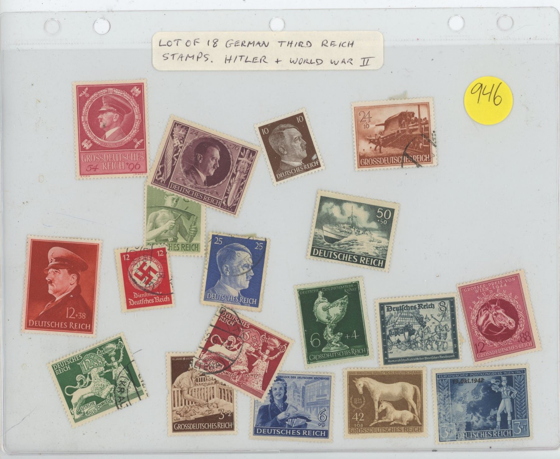 Lot of 18 German Nazi Third Reich Stamps depicting Adolf Hitler and World War II scenes. Used. Hinged.