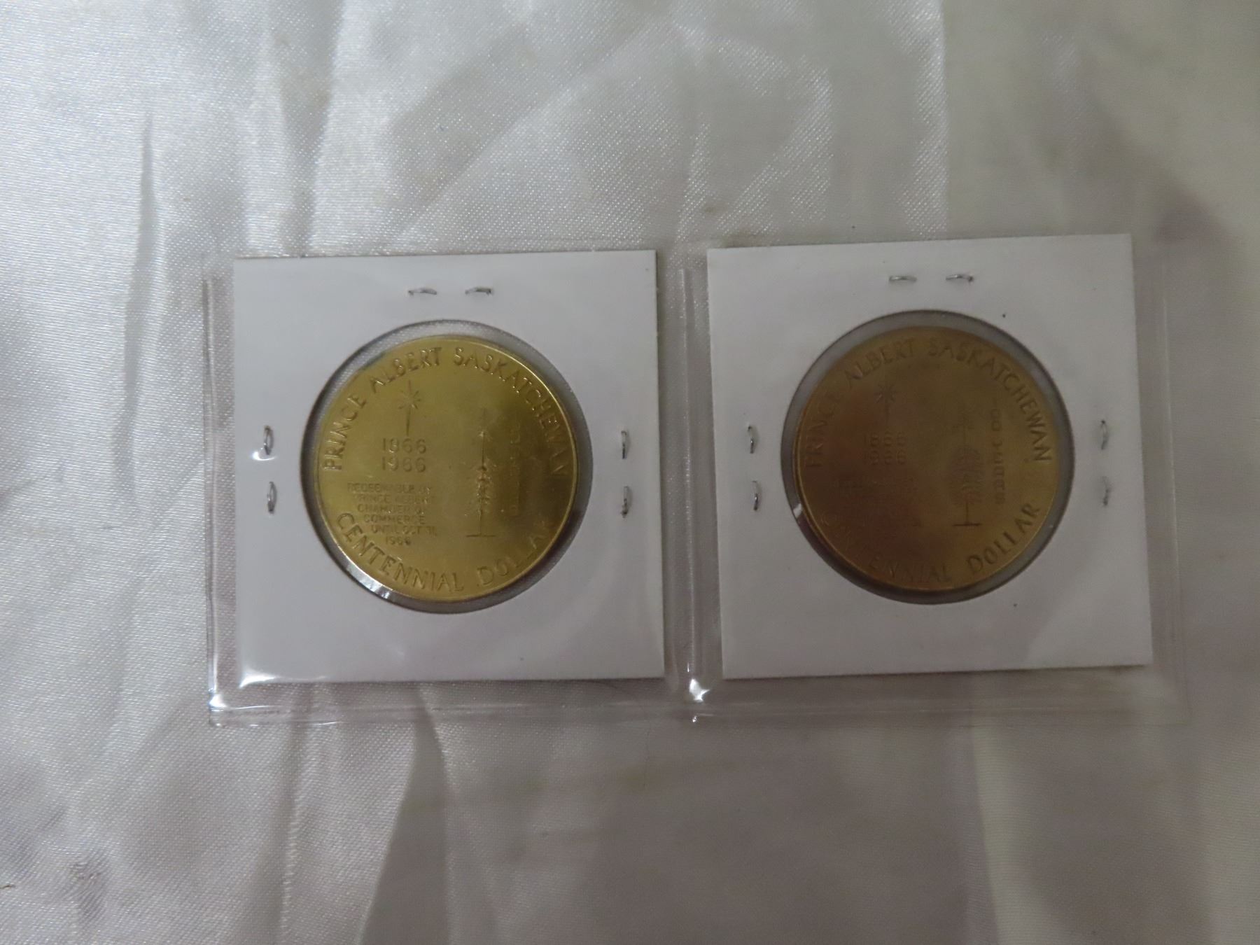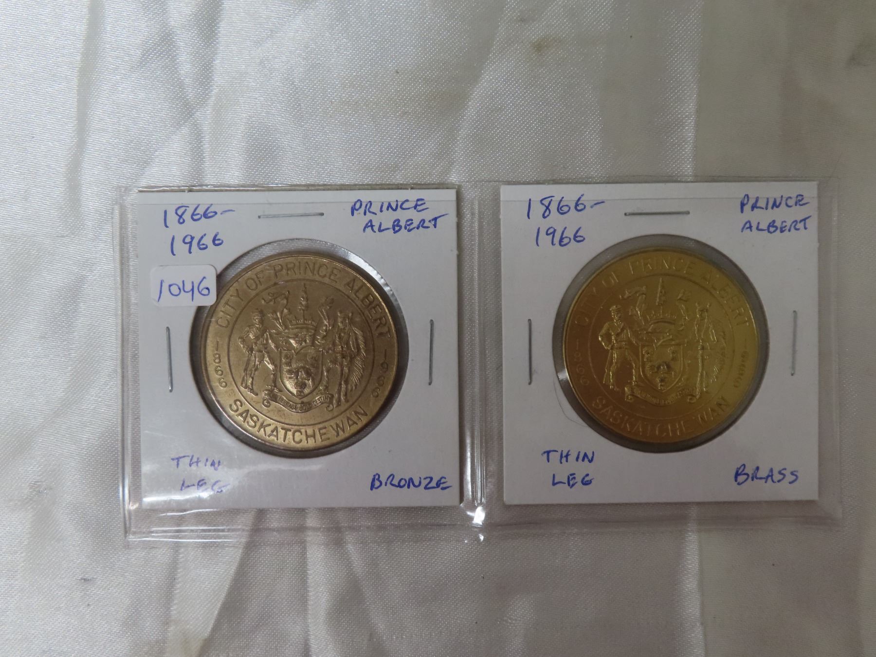 Lot of 2 1866 – 1966 Prince Albert, Saskatchewan Centennial Trade Dollars. Includes bronze & brass. Both with thin leg on First Nations Chief. BU.