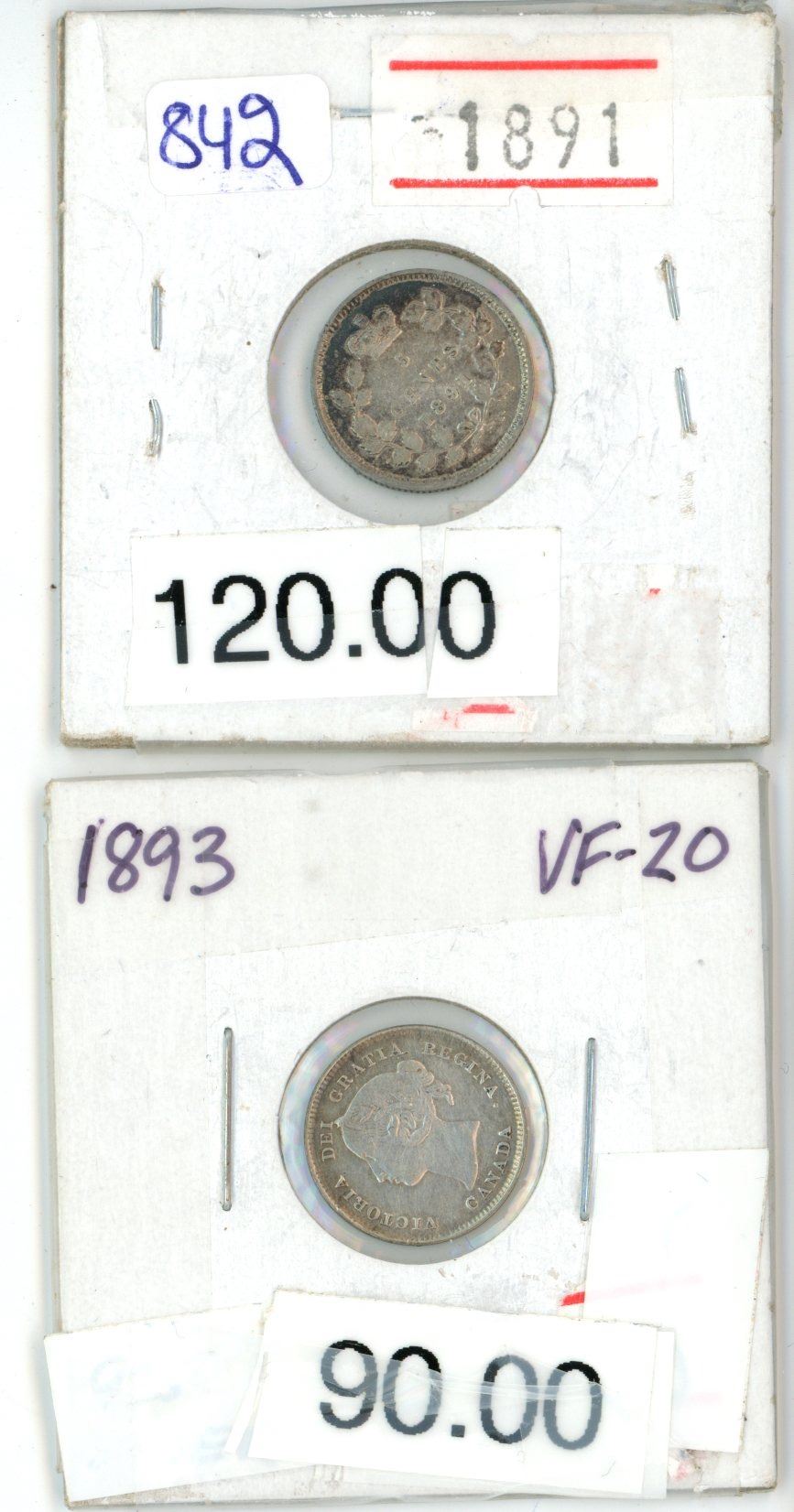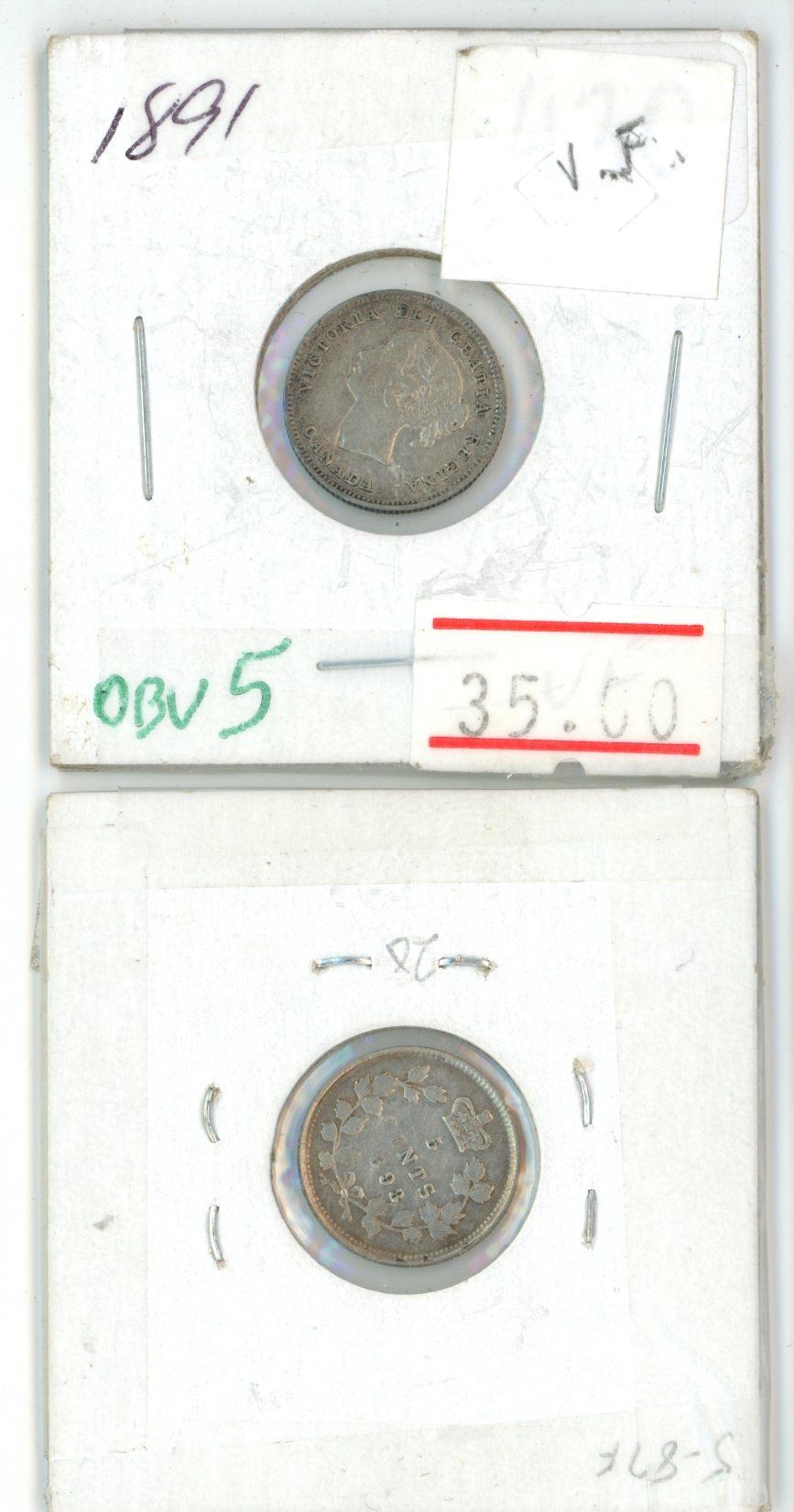 Lot of 2 (1891 and 1893) canadian silver 5 cent coins