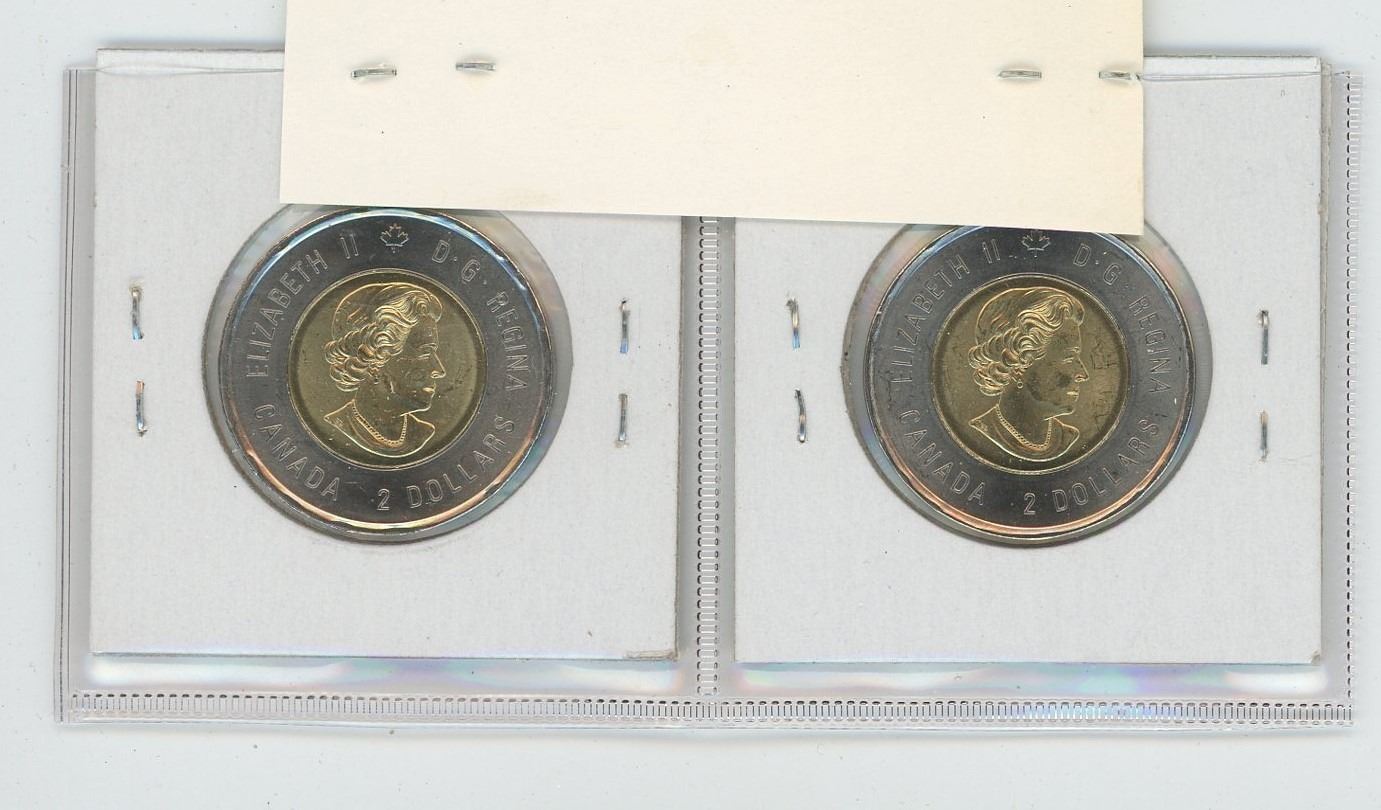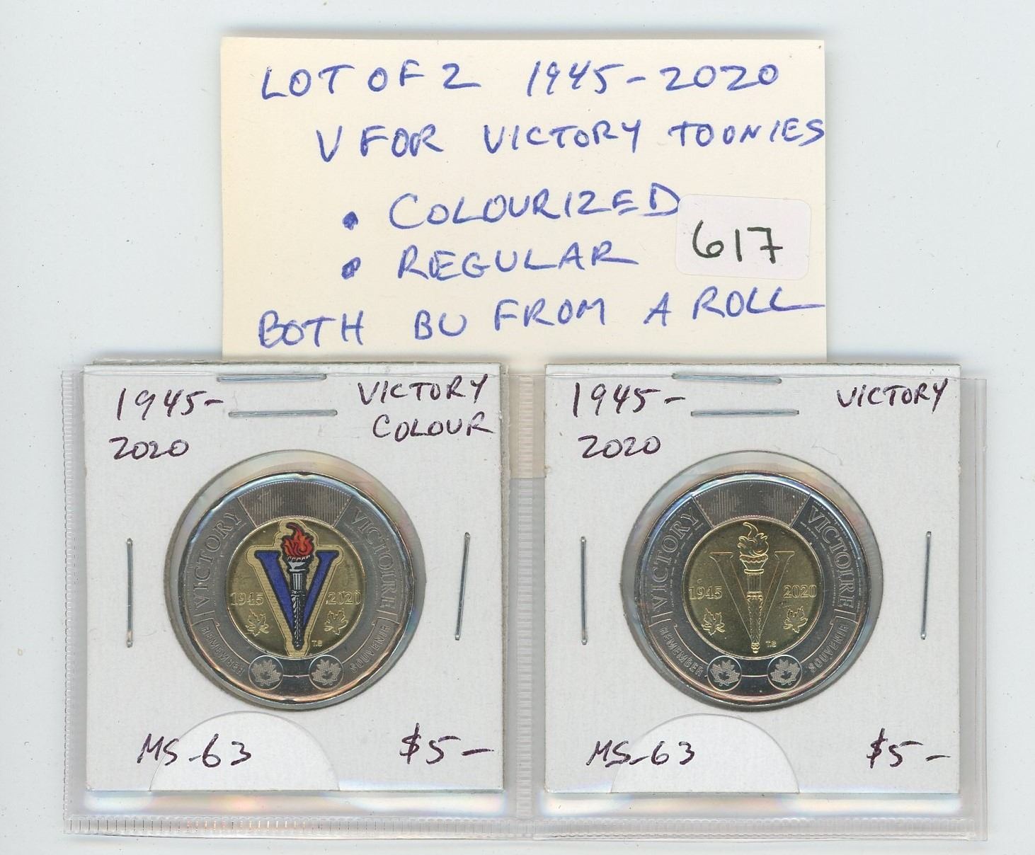 Lot of 2 1945-2020 V For Victory (End of World War II) Toonies. Includes red & blue Colourized Torch and regular. Both BU from an original roll. Nice.
