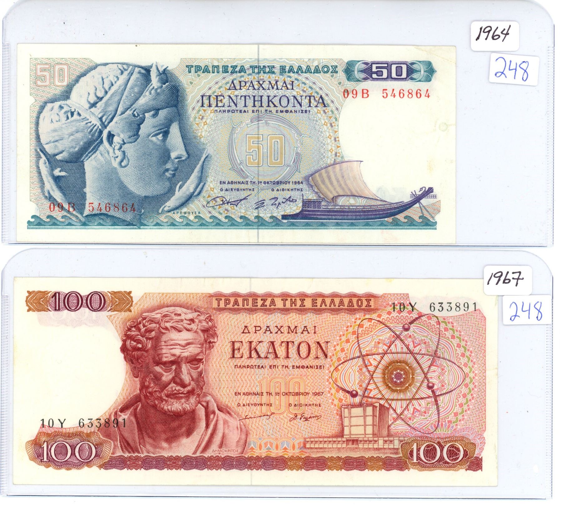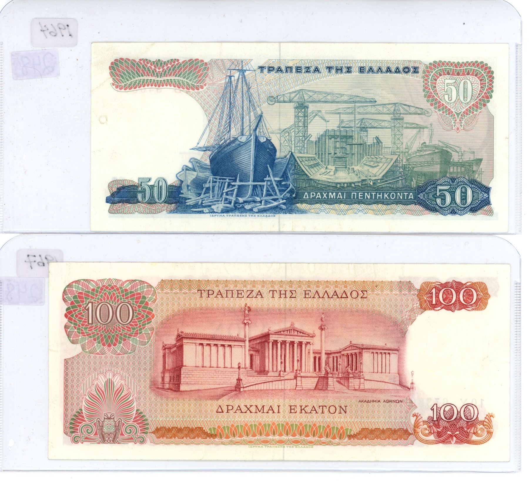 Lot of 2 - 1964 Greece 50 & 1967, 100 bills