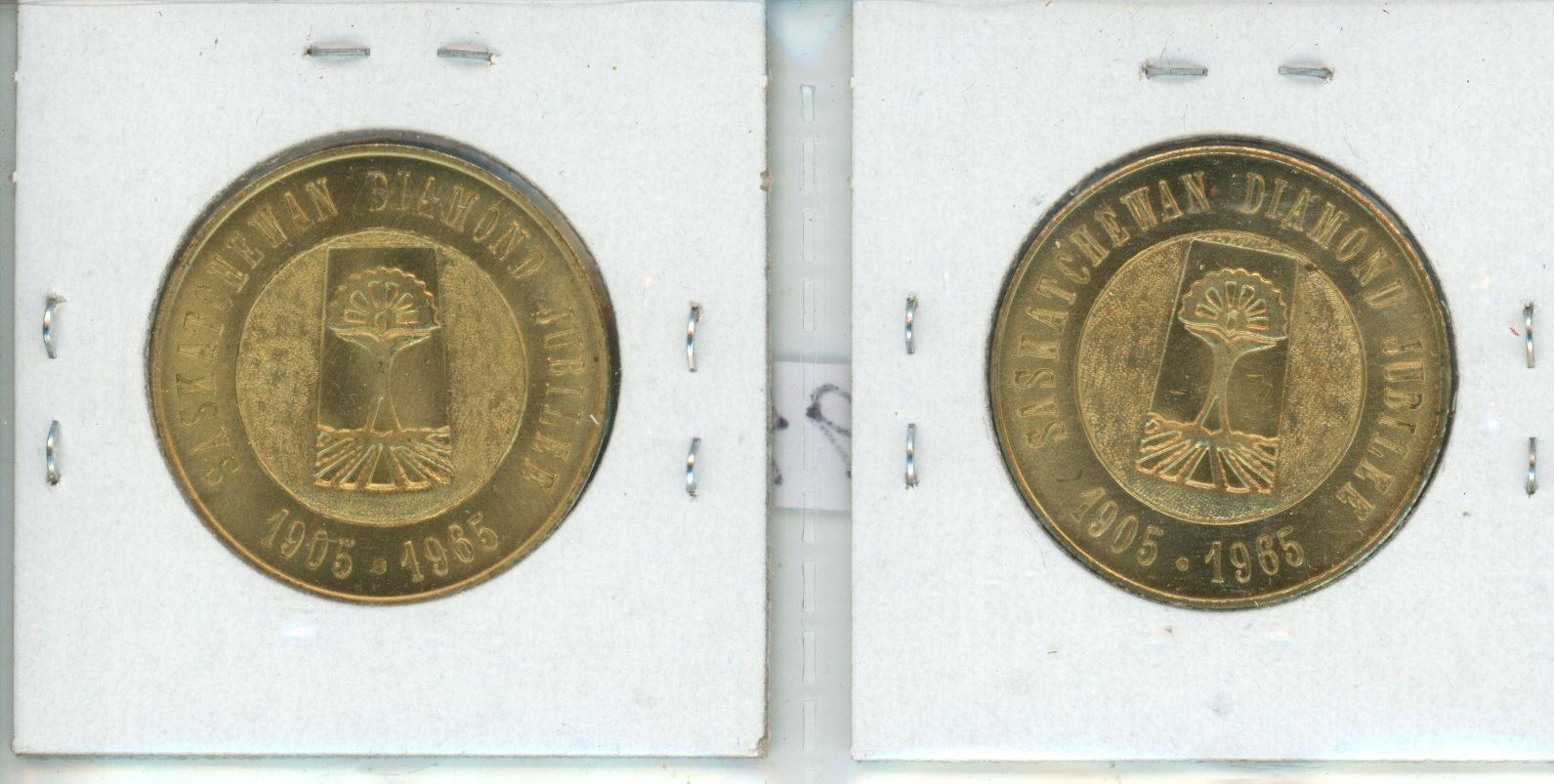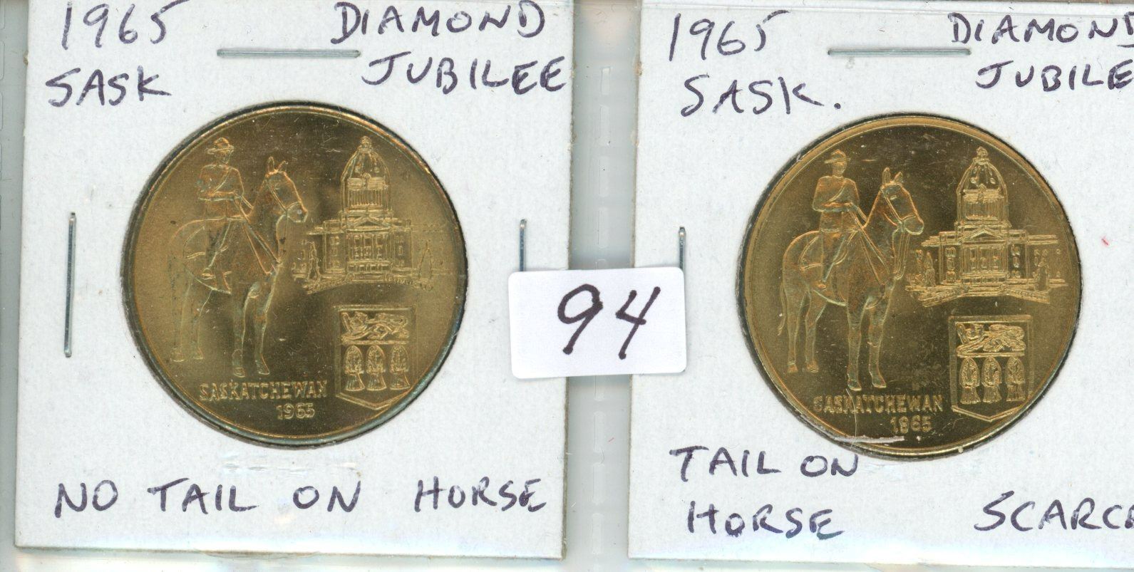 Lot of 2 1965 Saskatchewan Diamond Jubilee medals. Includes both varieties: No Tail on Horse & Scarce Tail on Horse with doubling of date & Saskatchewan. BU.