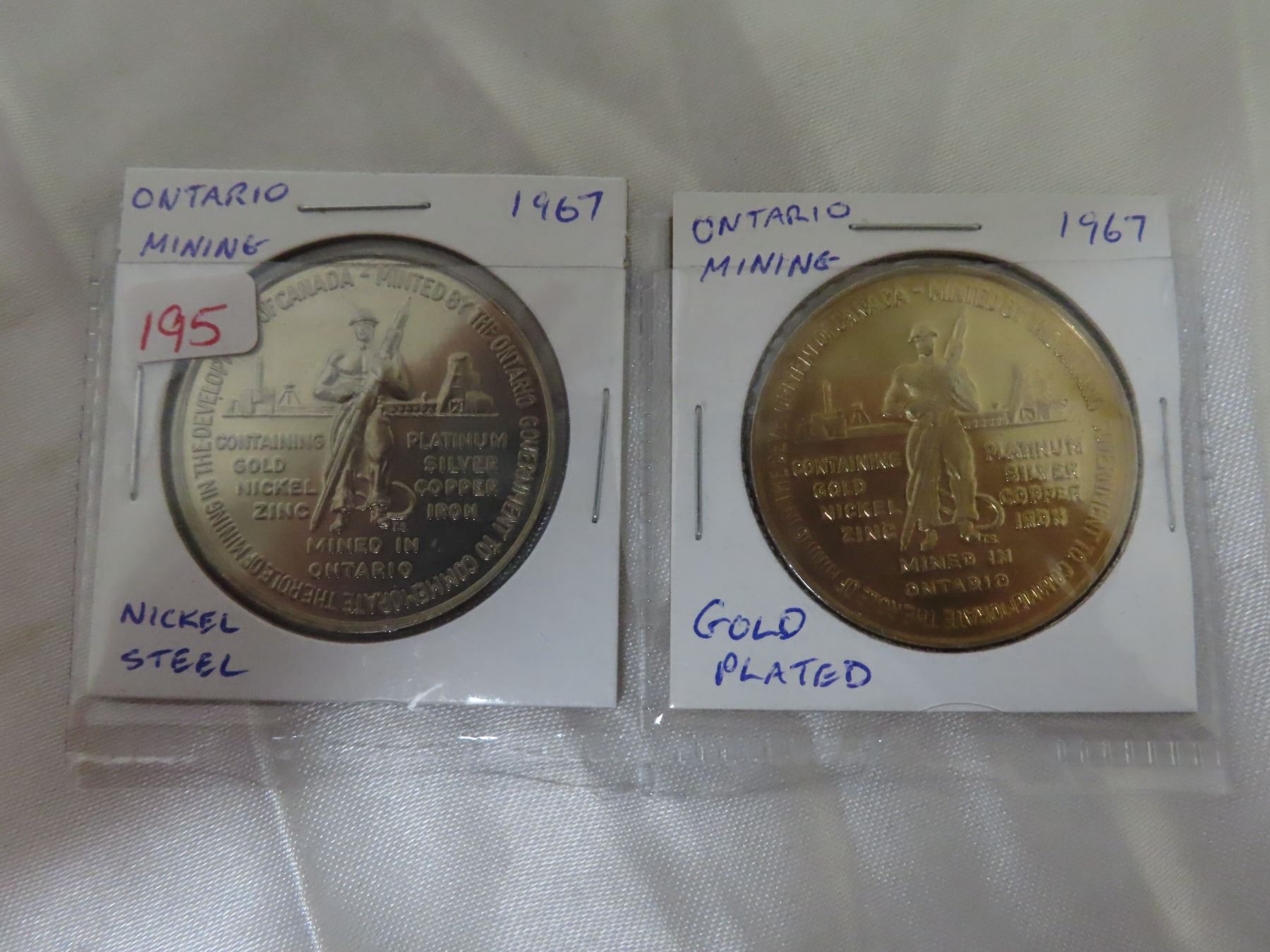 Lot of 2 1967 Ontario Mining Medals made of gold, platinum, silver, nickel, copper, zinc & iron mined in Ontario. One is gold-plated.