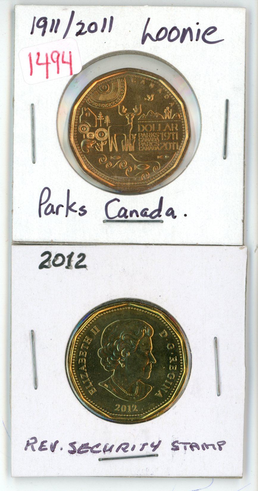 Lot of 2 (2011 parks canada and 2012 Rev security stamp) canadian loonies