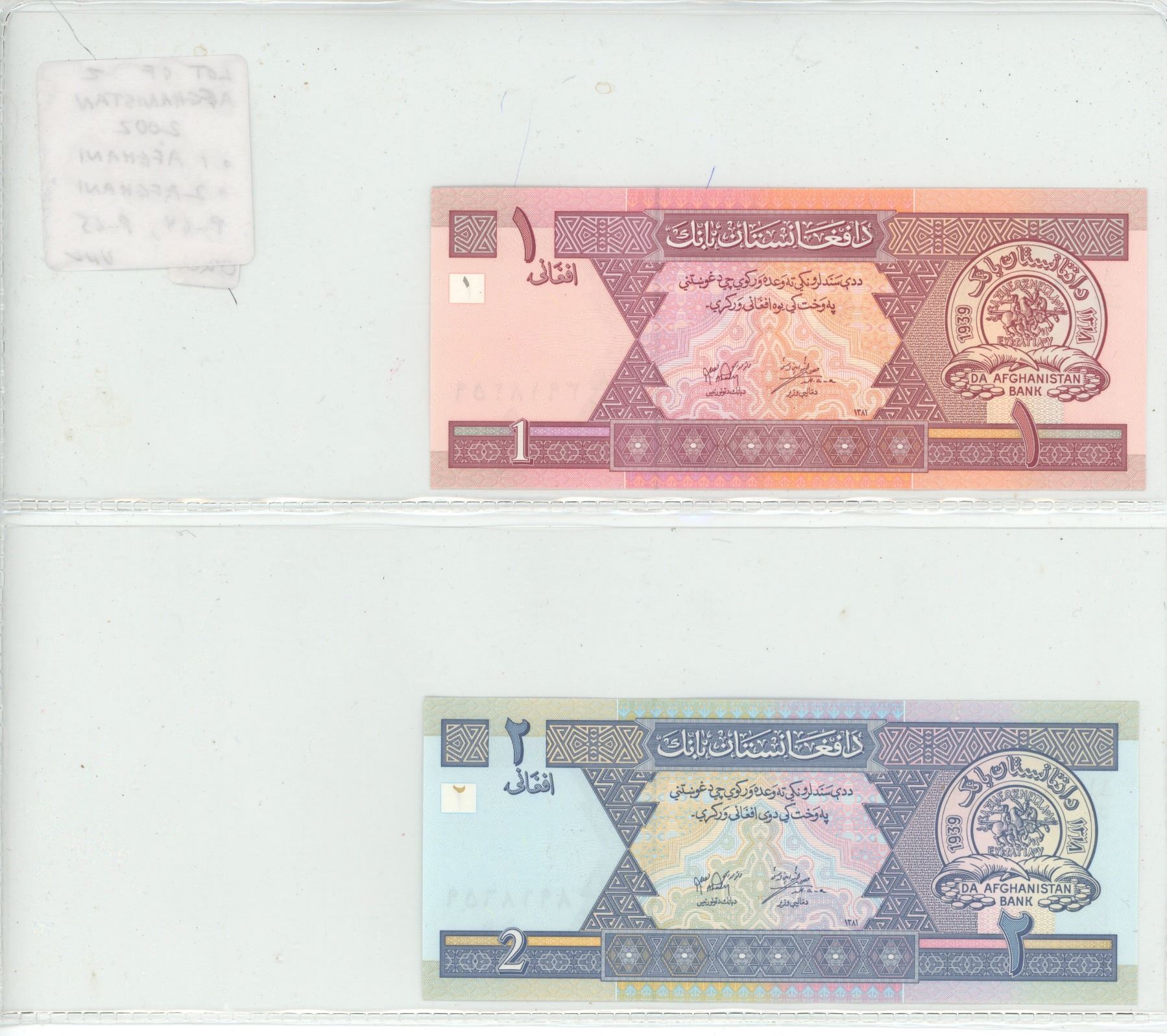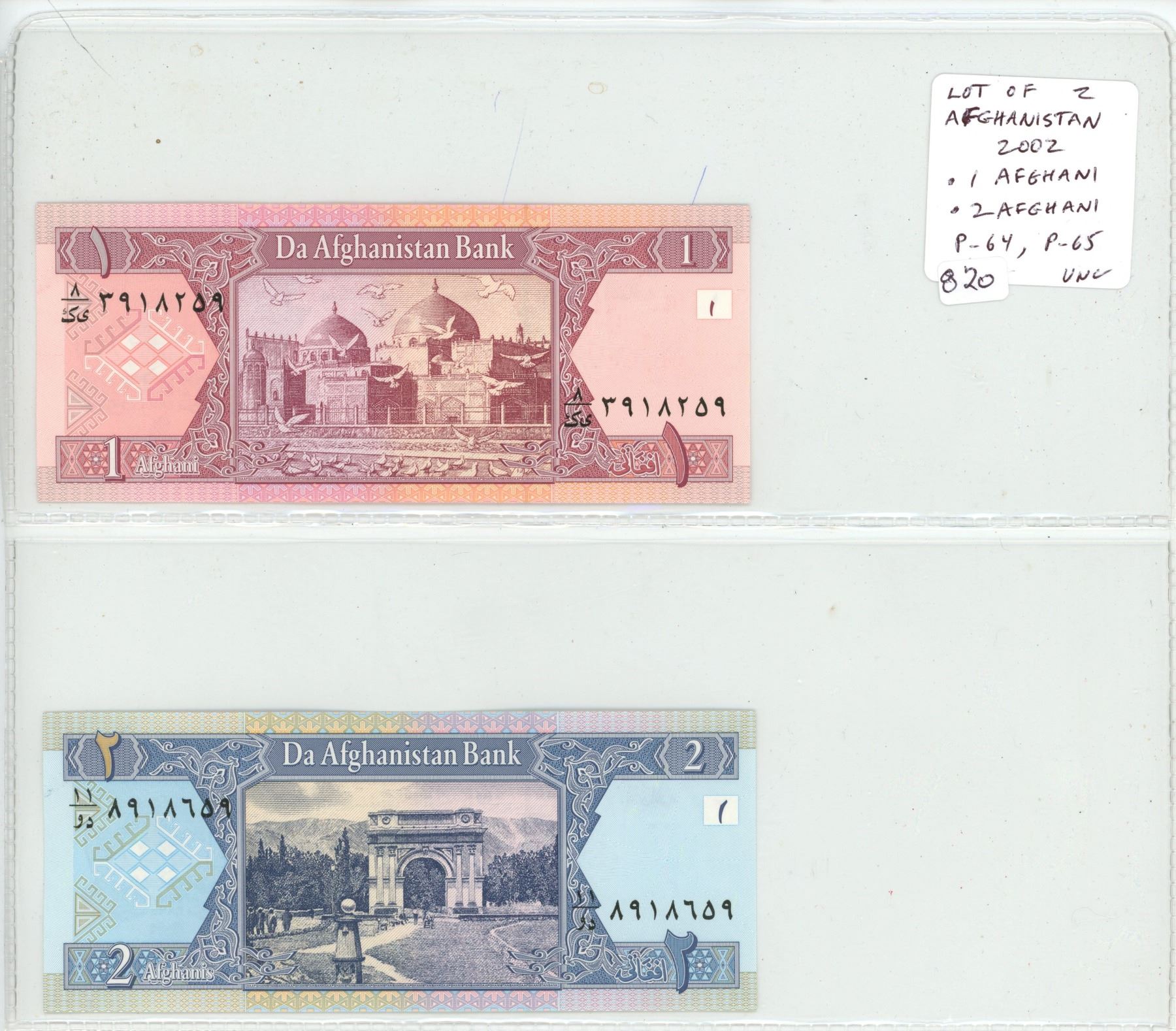 Lot of 2 Afghanistan 2002 notes. 1 Afghani & 2 Afghani. Da Afghanistan Bank. P-64, P-65. Unc.