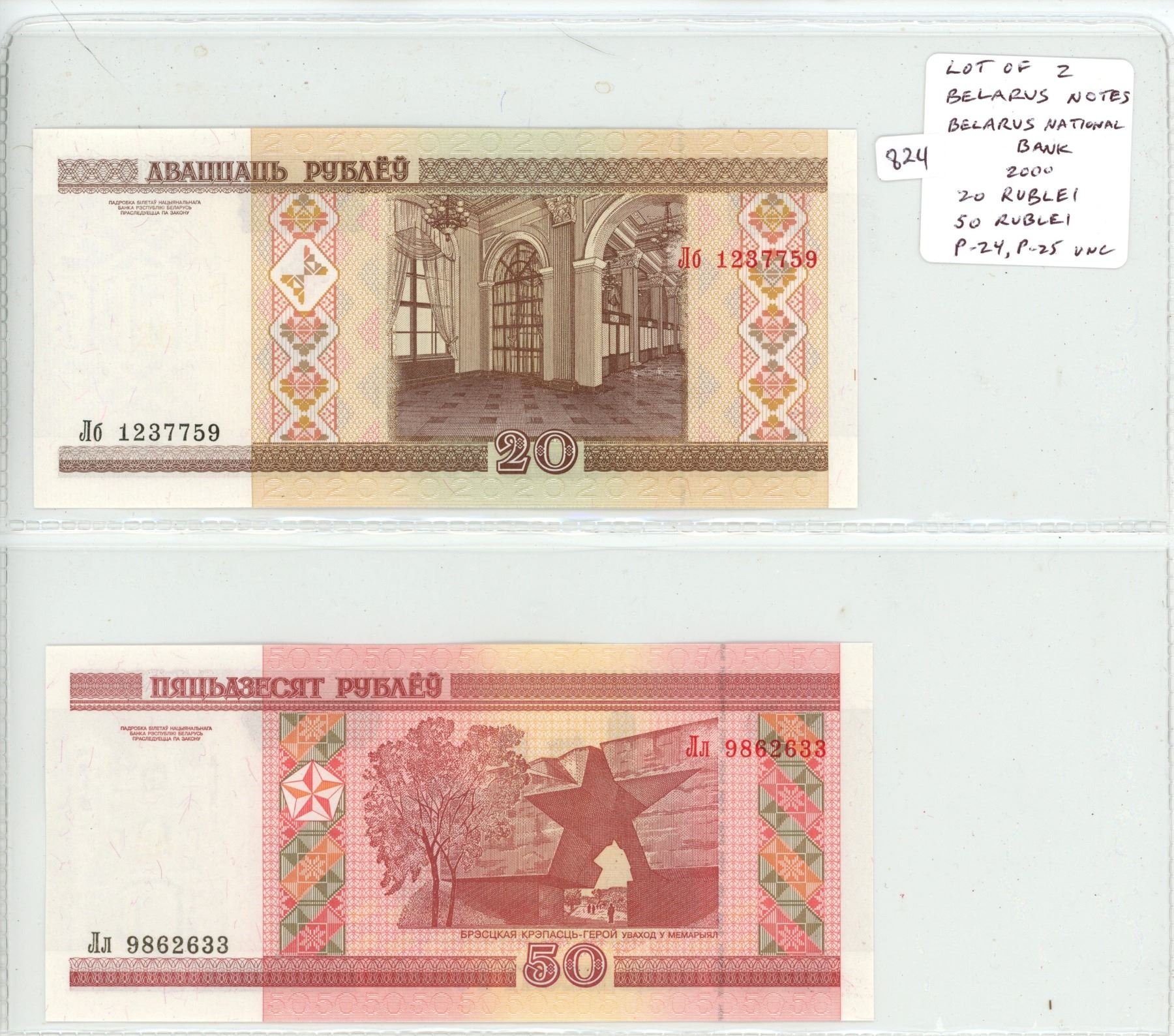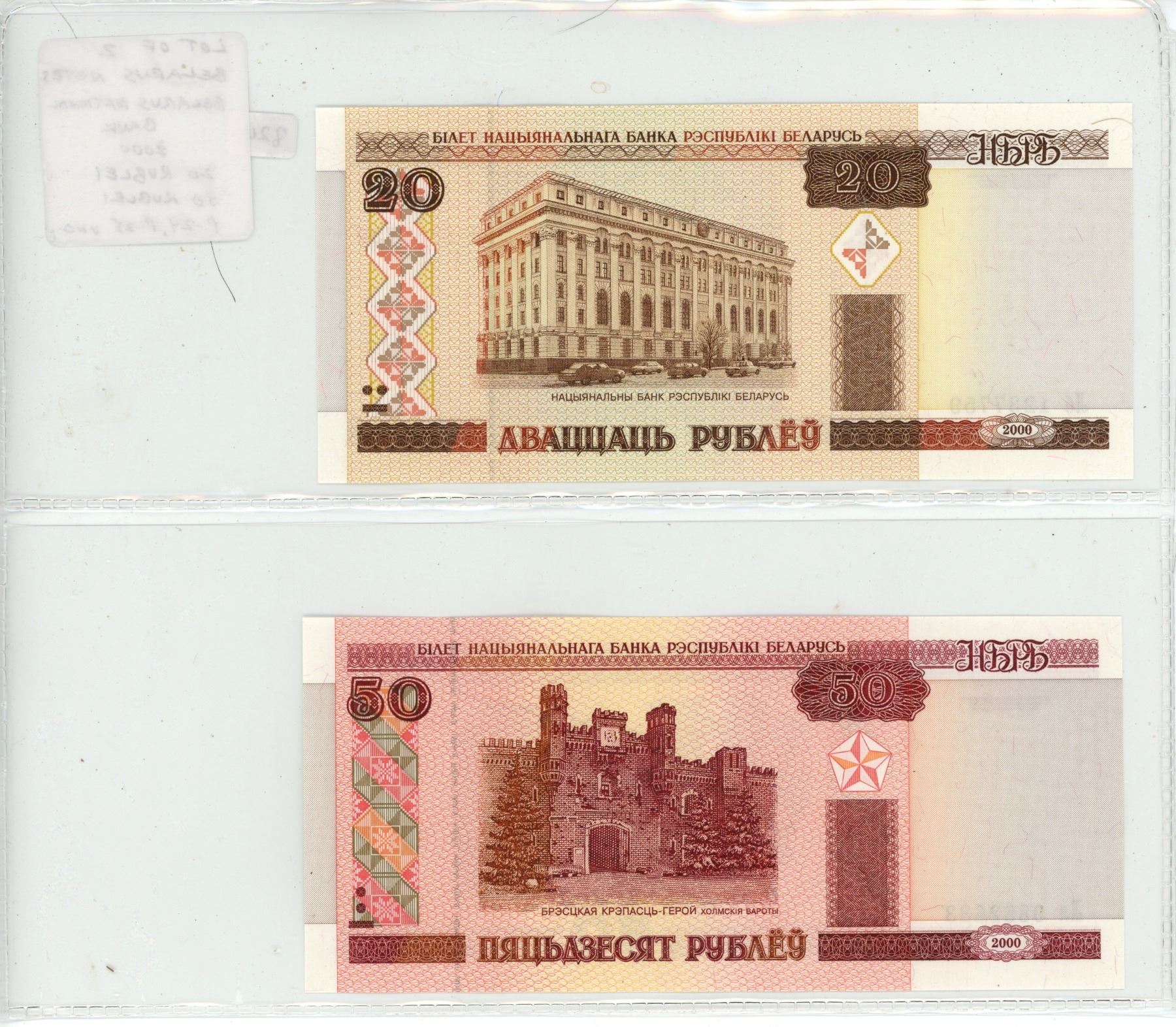 Lot of 2 Belarus Notes. Belarus National Bank. 2000 20 Rublei and 50 Rublei. P-24, P-25. Unc.