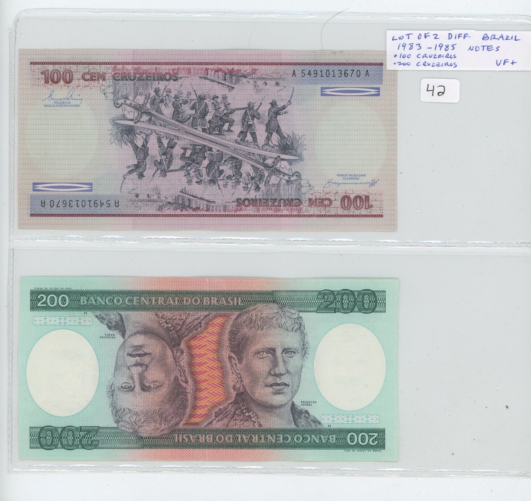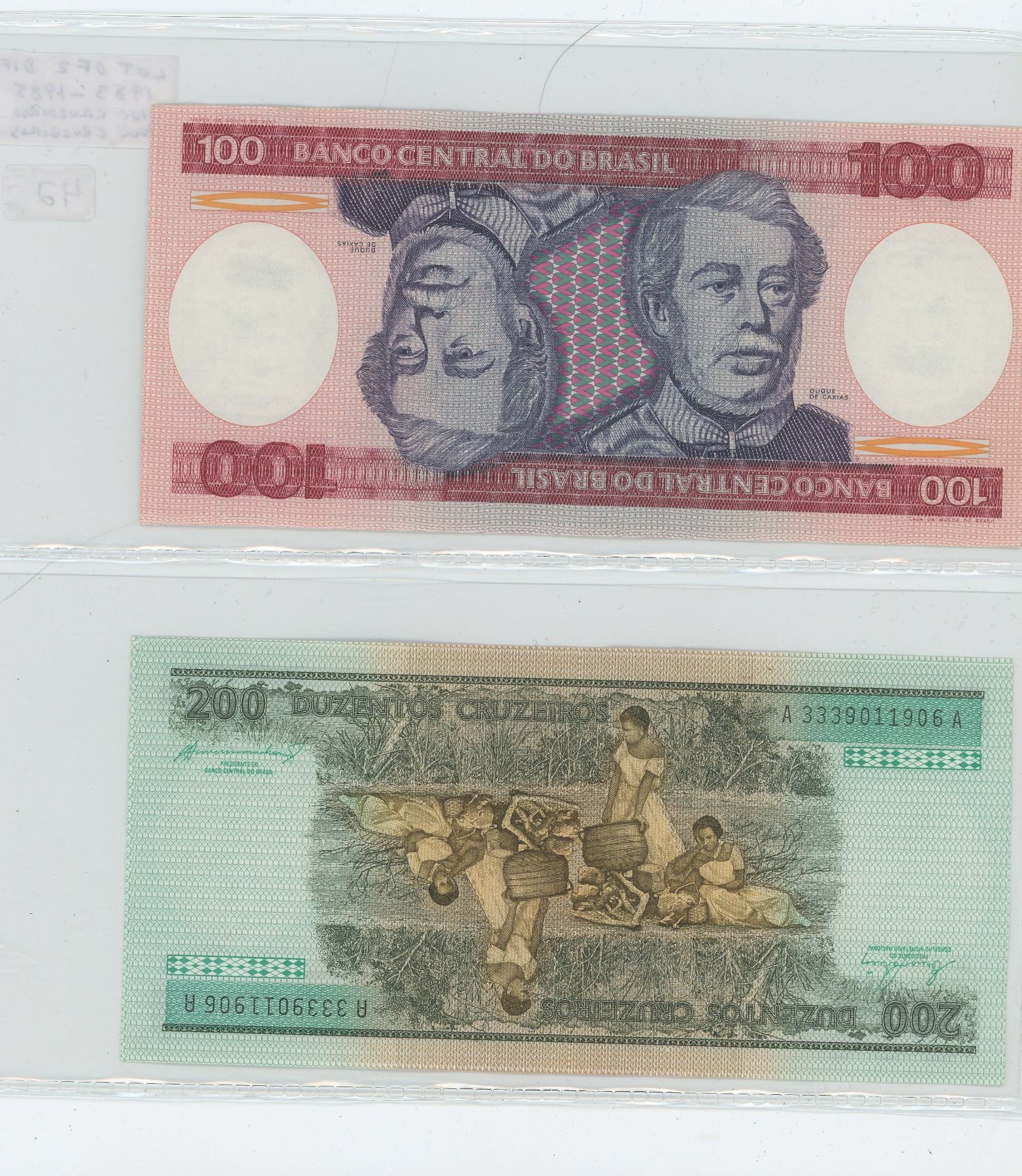 Lot of 2 Brazil bank notes. Both notes from the 1983-1985 series including 100 cruzeiros & 200 cruzeiros. VF+.