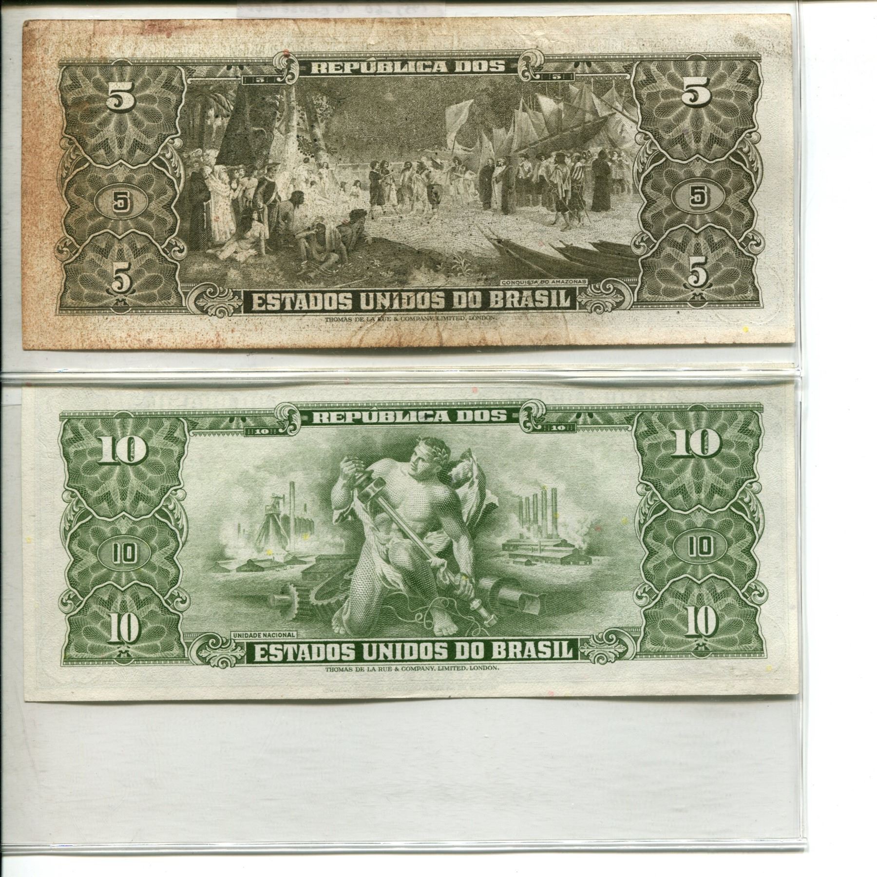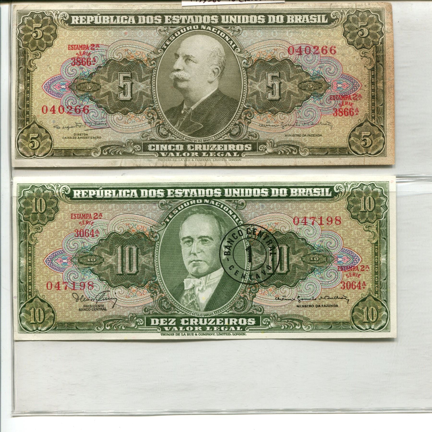 Lot of 2 Brazil notes. 1953-1959 5 Cruzeiros & 1953-1960 10 Cruzeiros. AU-Unc.