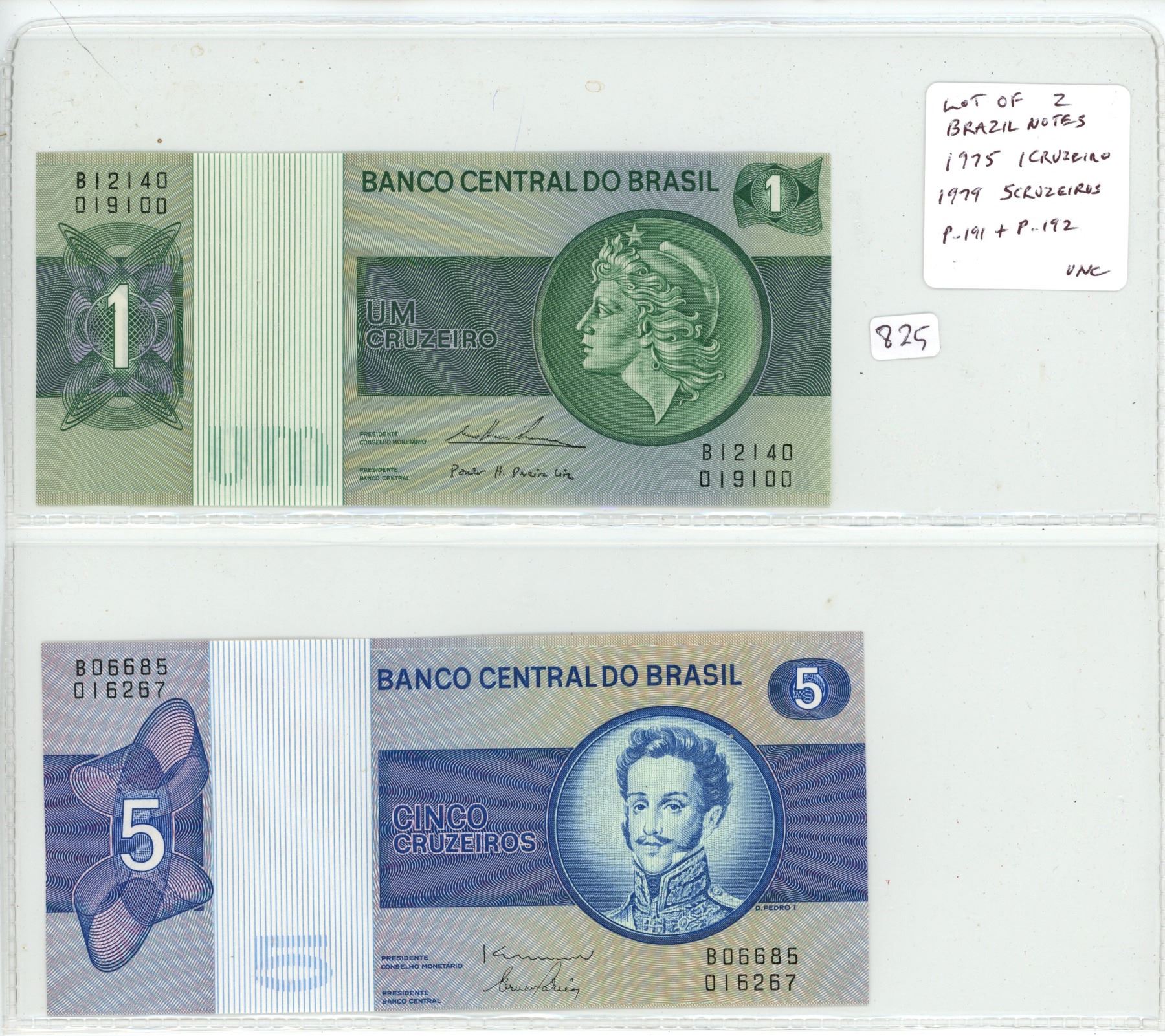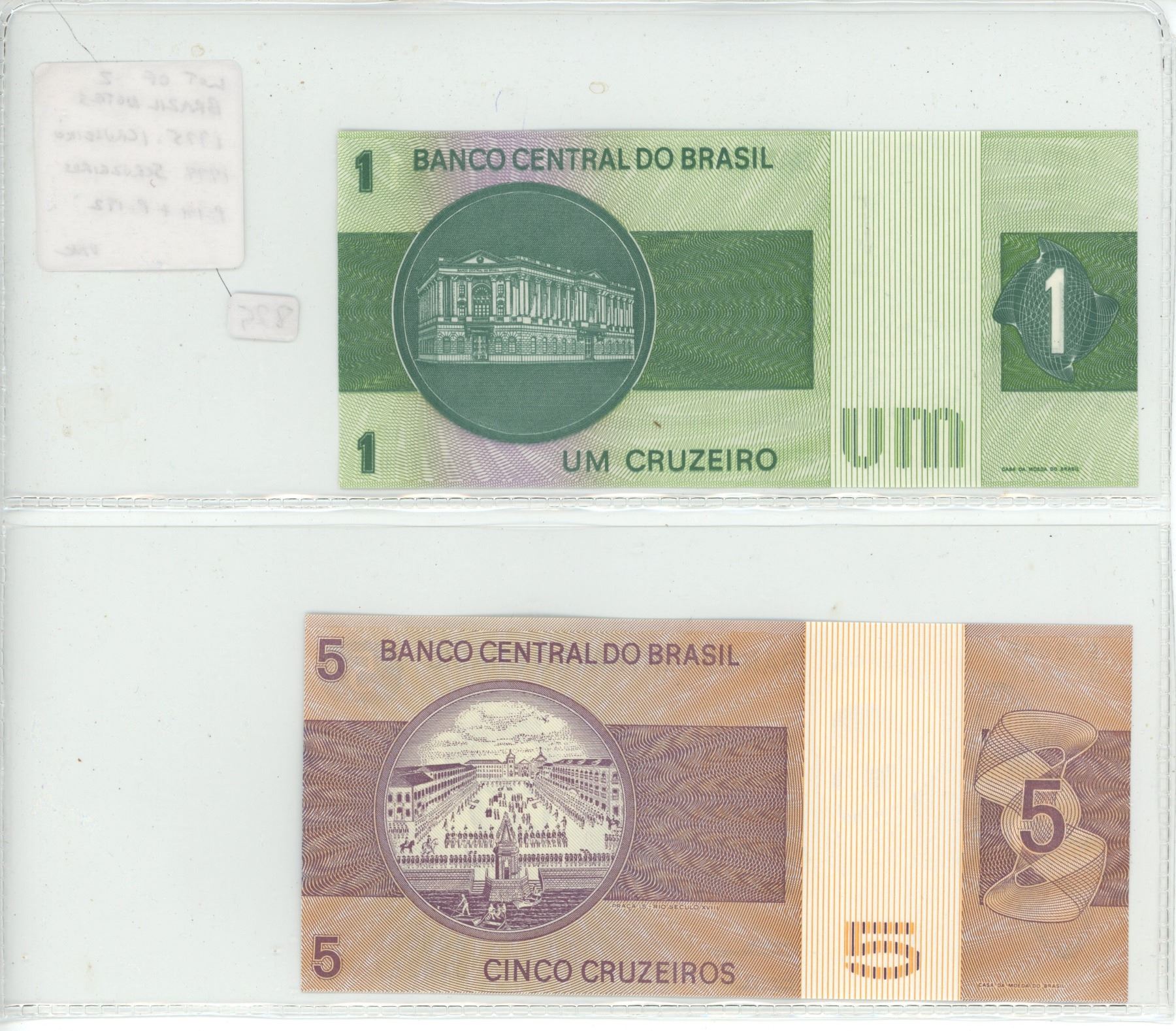 Lot of 2 Brazil notes. Central Bank of Brazil. 1975 1 Cruzeiro, 1979 5 Cruzeiros. P-191, P-192. Unc.
