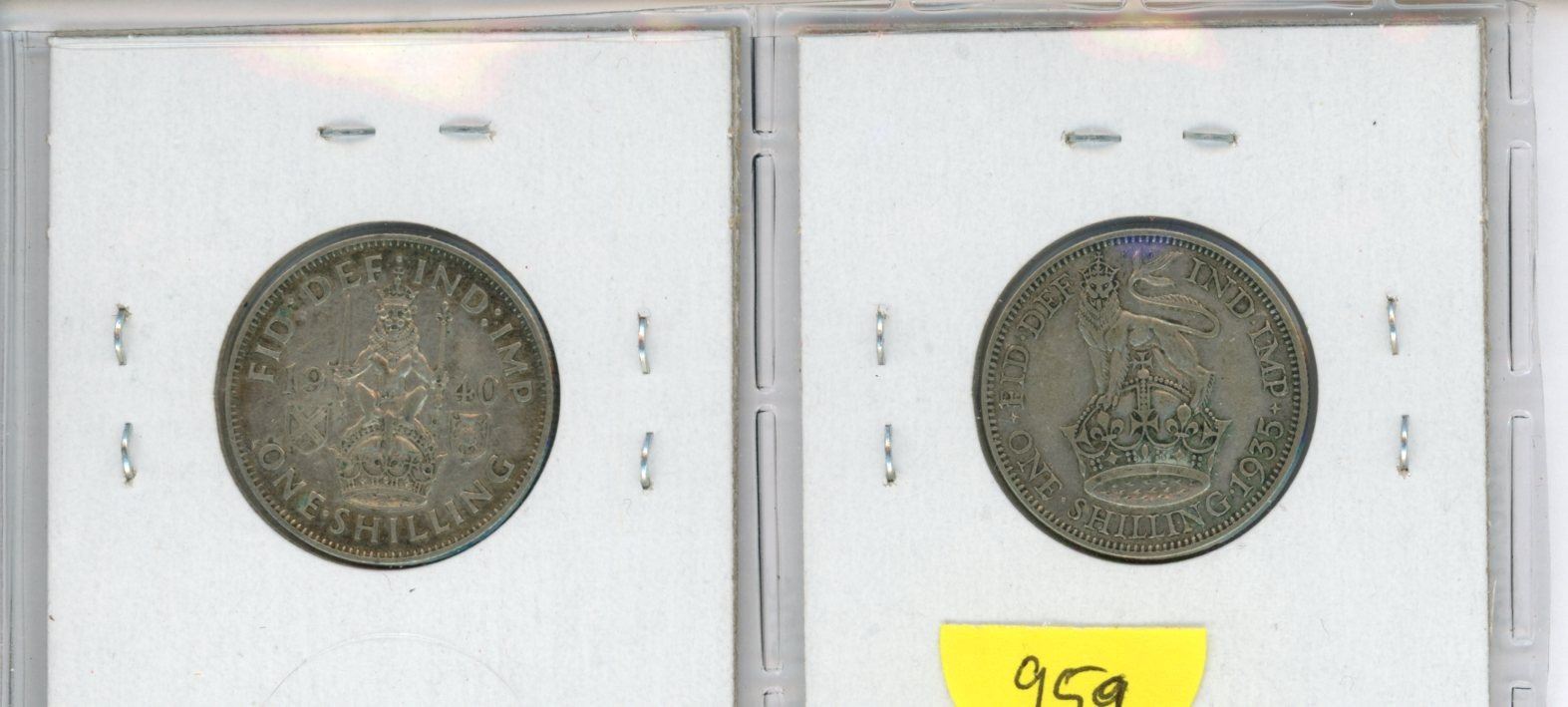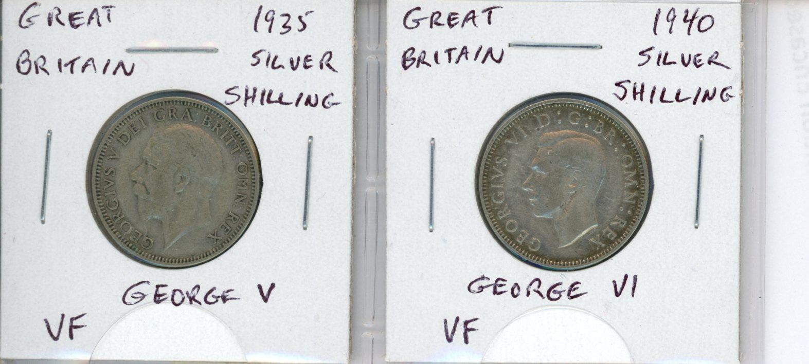 Lot of 2 British Silver Shillings from 2 different Kings. 1935 George V and 1940 George VI. Both coins grade VF.