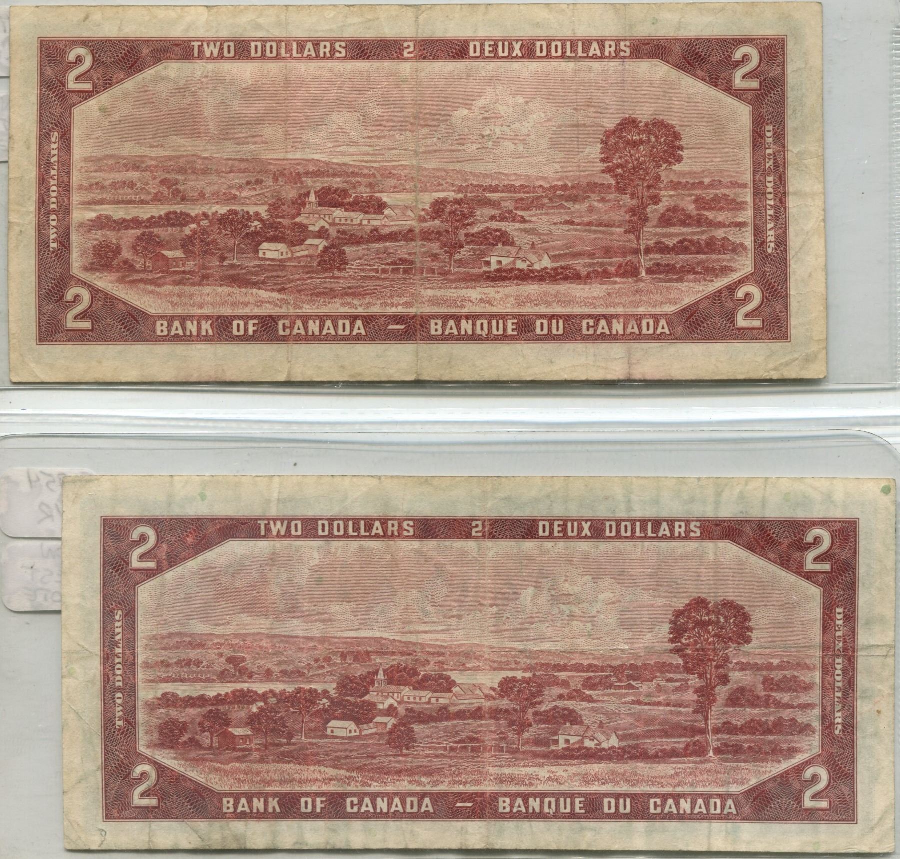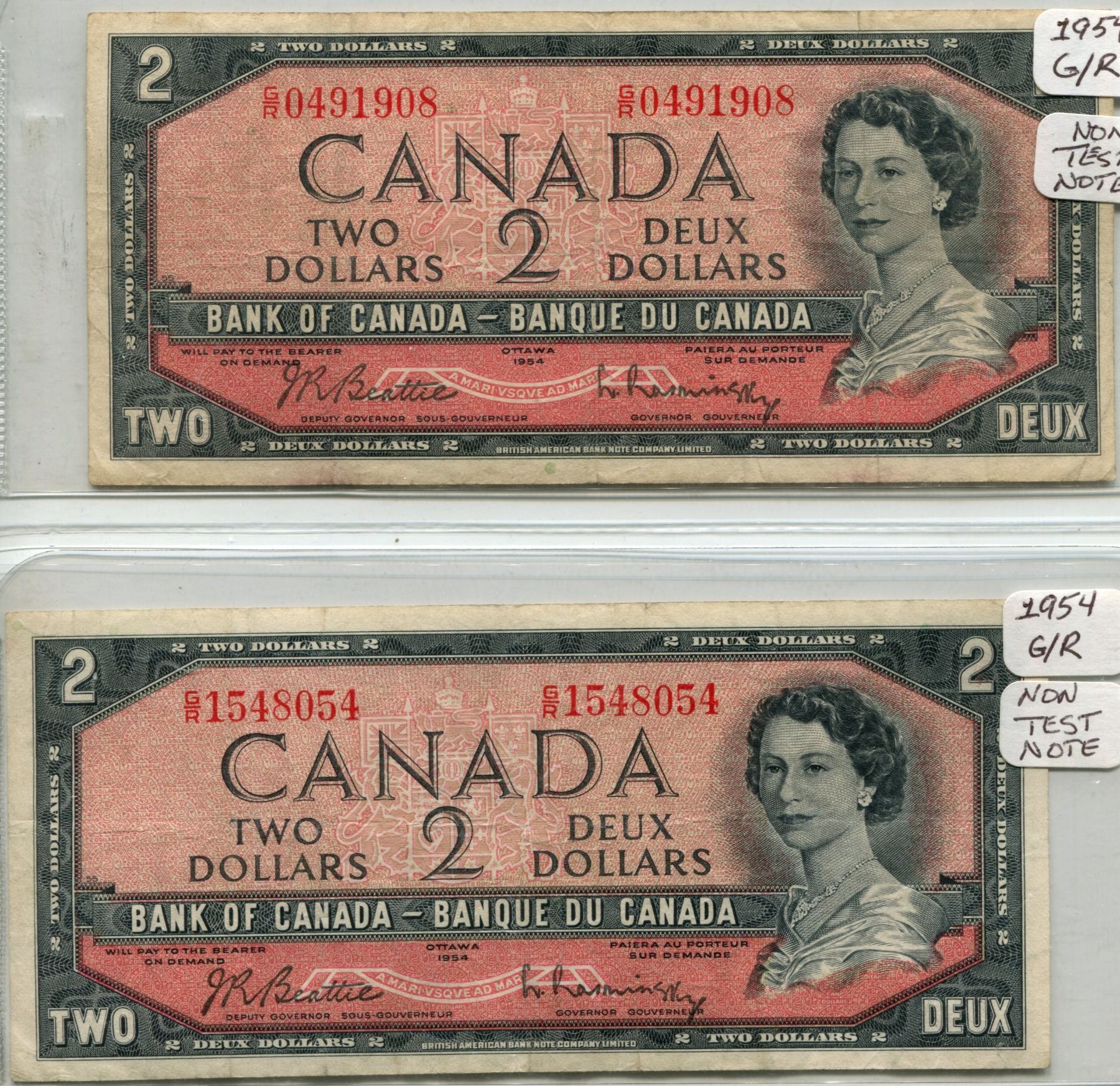 Lot of 2 Canada 'Non Test' $2 bills,  Beattie Rasminsky, G/R0491908 & G/R1548054