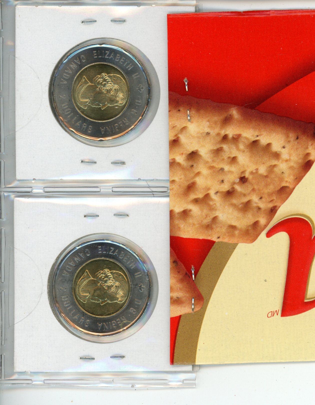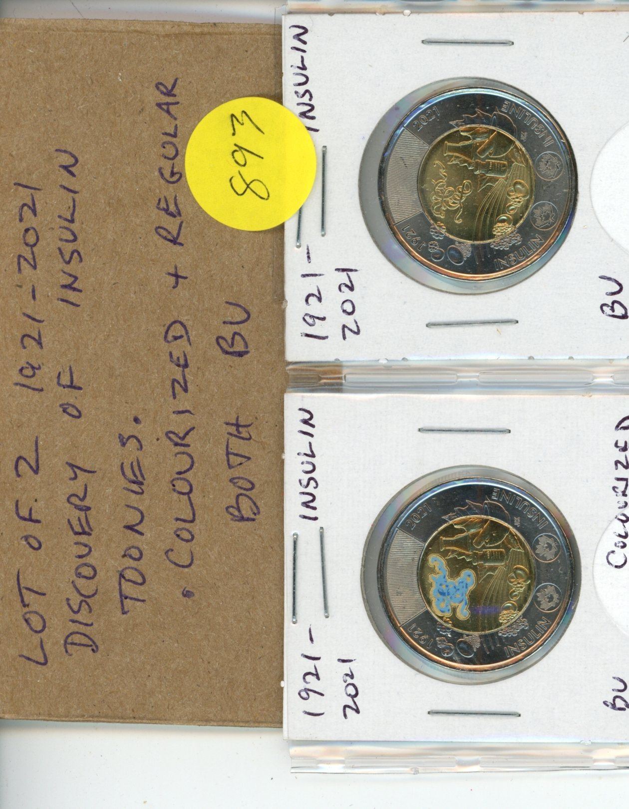 Lot of 2 Canadian 1921 – 2021 Discovery of Insulin Toonies. Colourized and Regular. Both BU from an original roll.