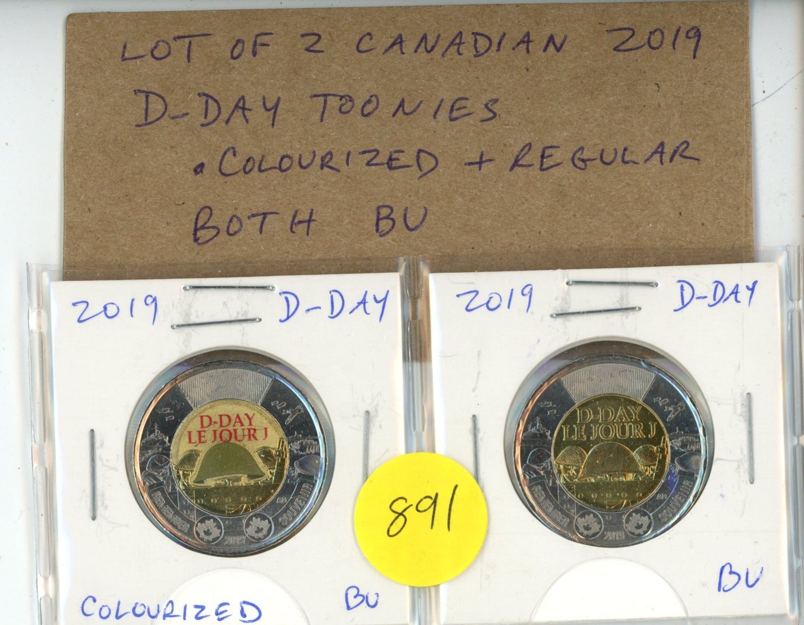 Lot of 2 Canadian 2019 D-Day Toonies. Colourized and Regular. Both BU from an original roll.