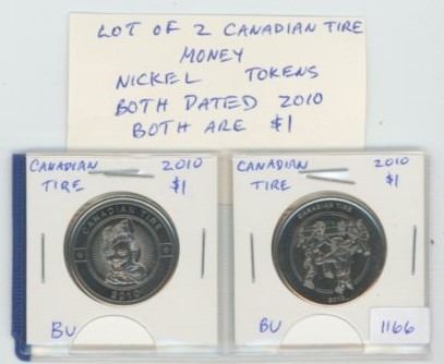 Lot of 2 Canadian Tire Money Nickel Tokens. Both different, both dated 2010. Both are worth $1 each. Both BU. Nice.
