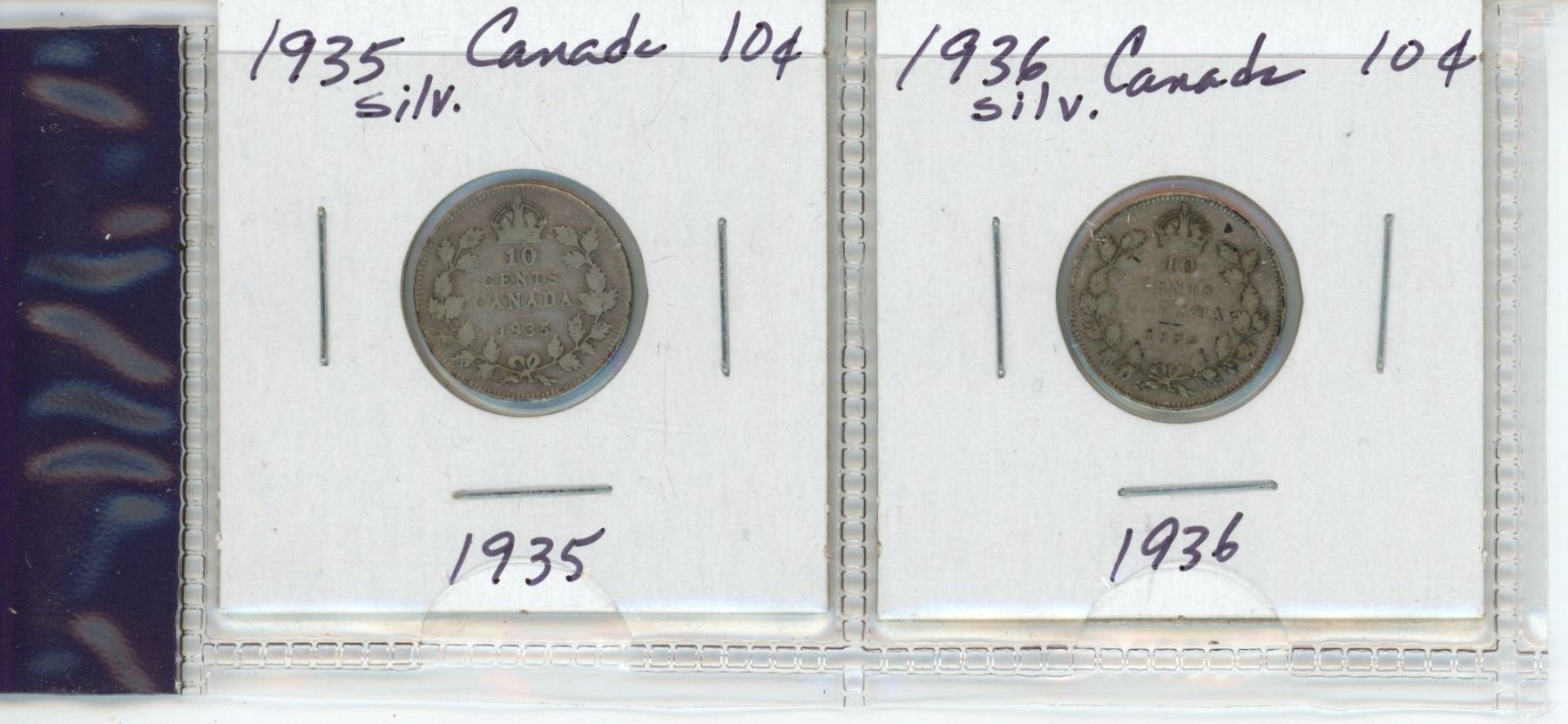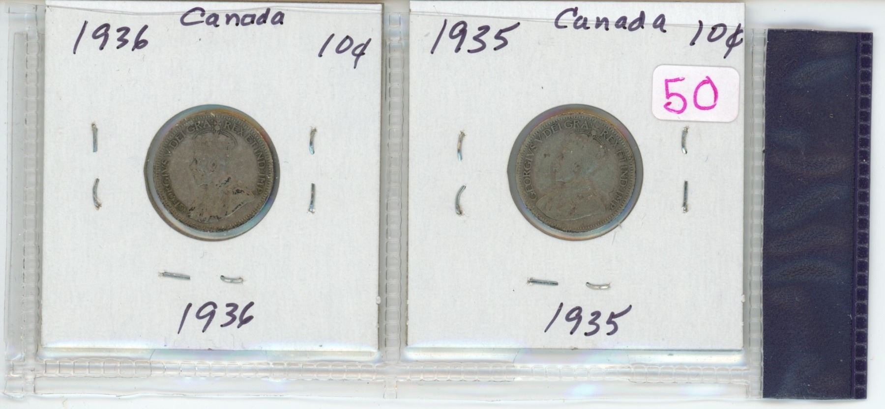 Lot of 2, Canadian silver 10 cent coins - 1935-1936