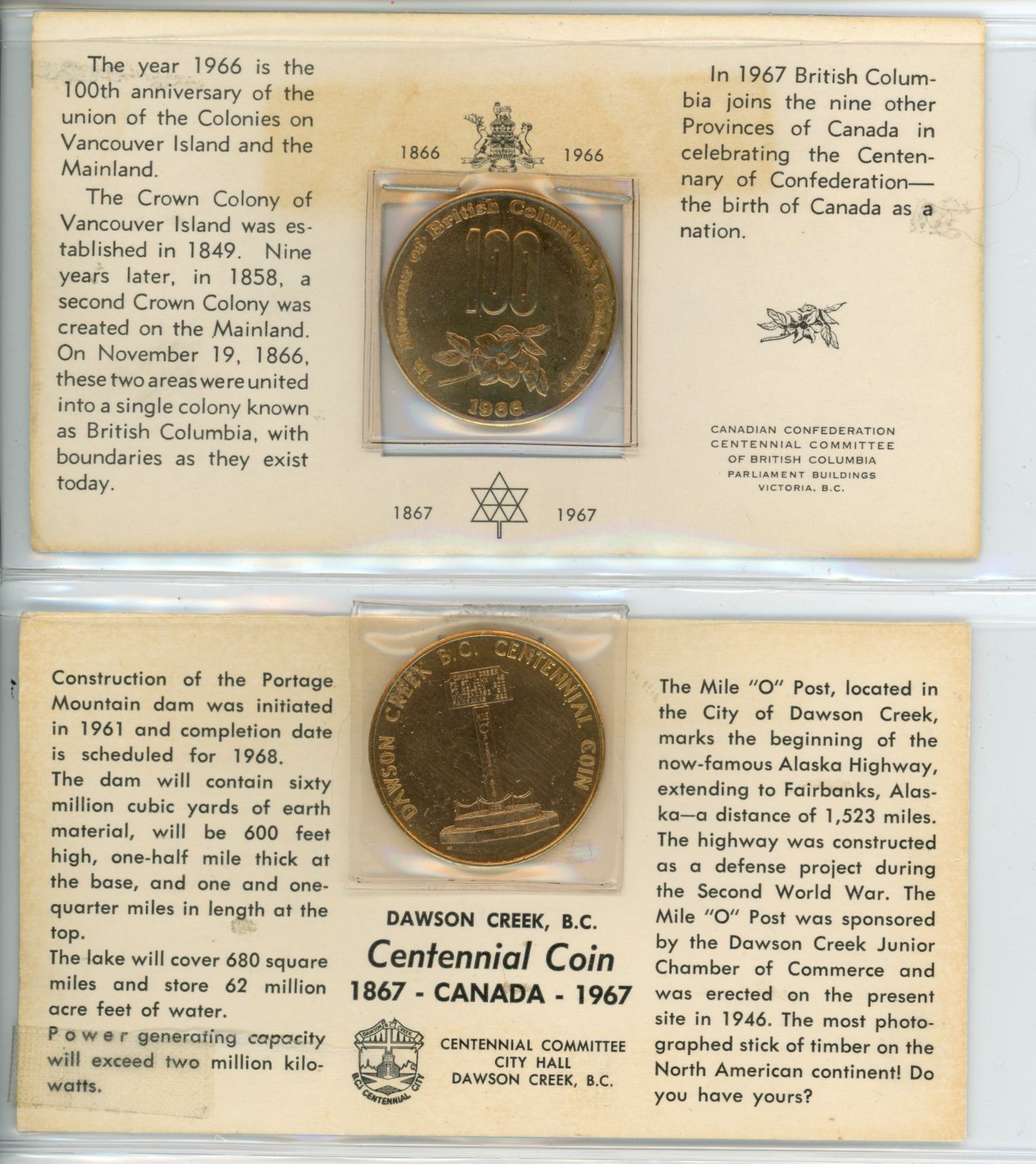 Lot of 2 Centennial Meadllions: British Columbia & Dawson Creek