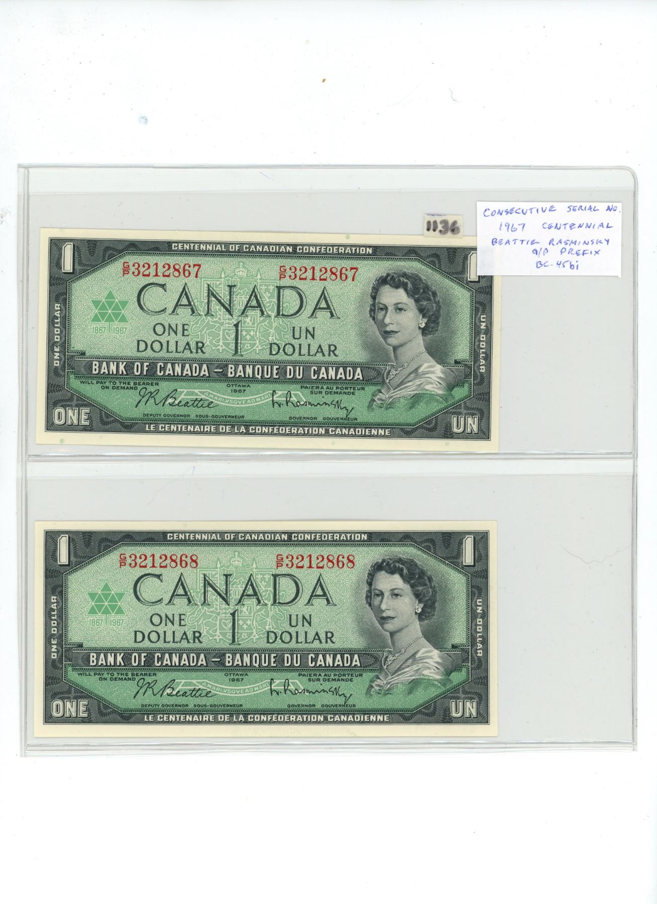 Lot of 2 Consecutive Serial Number 1967 $1 notes. Beattie-Rasminsky signatures. G/P Prefix. Serial Numbers 3212867 & 3212868. BC-45bi.
