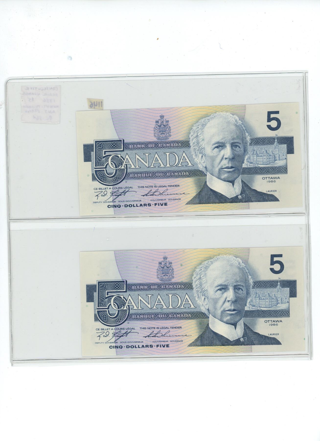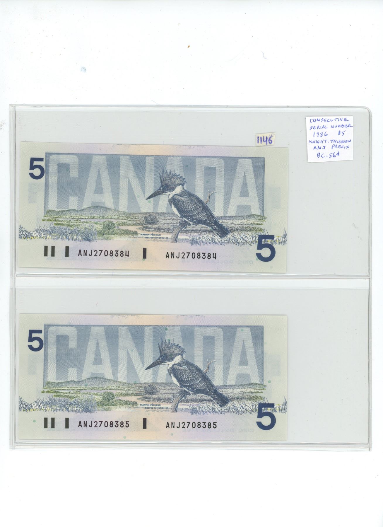 Lot of 2 Consecutive Serial Number 1986 $5 notes. Knight-Thiessen signatures. ANJ Prefix. Serial Numbers 2708384 & 2708385. BC-56d.