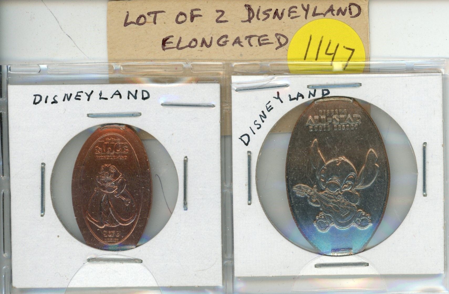 Lot of 2 Disneyland Elongated American Coins. Includes Alice in Wonderland Cent & Dumbo the elephant nickel.