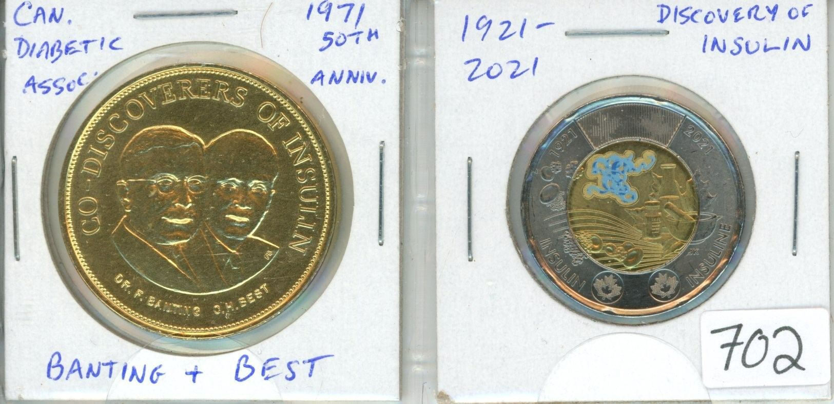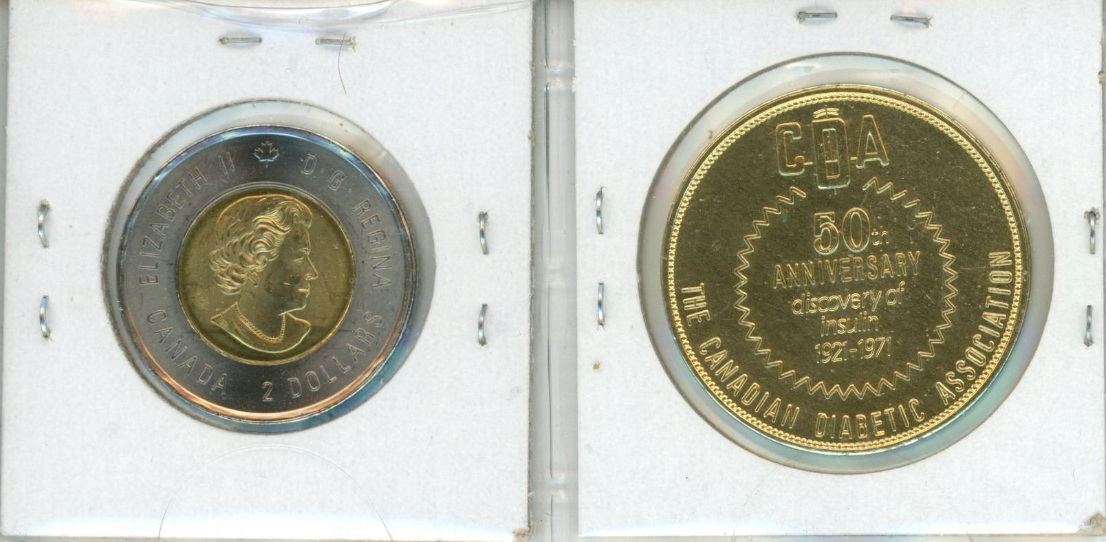 Lot of 2 Insulin Medal & Toonie. Includes Canadian Diabetes Association 1971 50th Anniversary of Drs. Banting & Best and 2021 Colourized 100th Anniversary of the Discovery of Insulin Toonie.