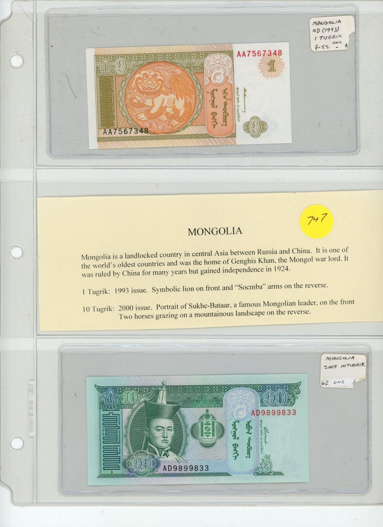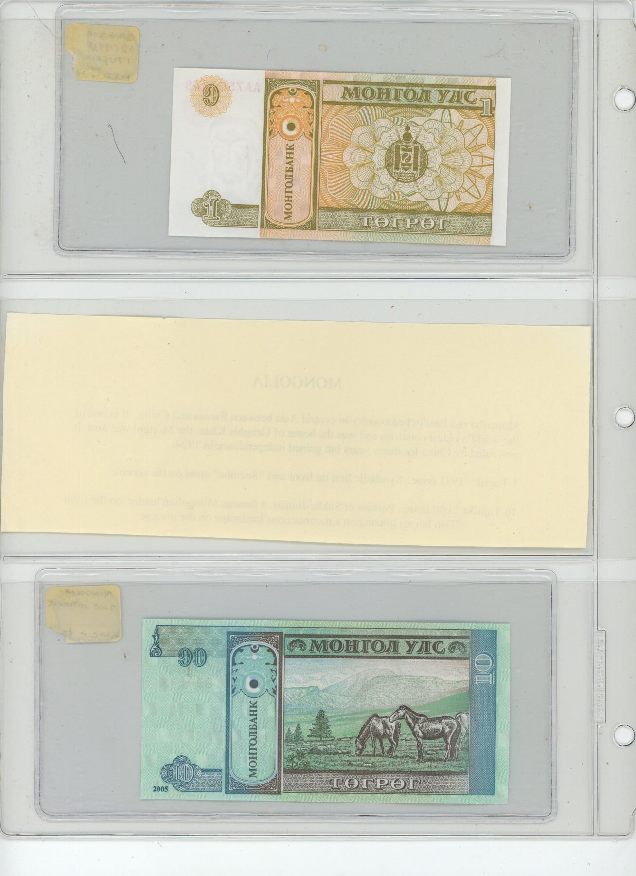 Lot of 2 Mongolia notes. 1993 1 Tugrik and 2005 10 Tugrik. Unc.