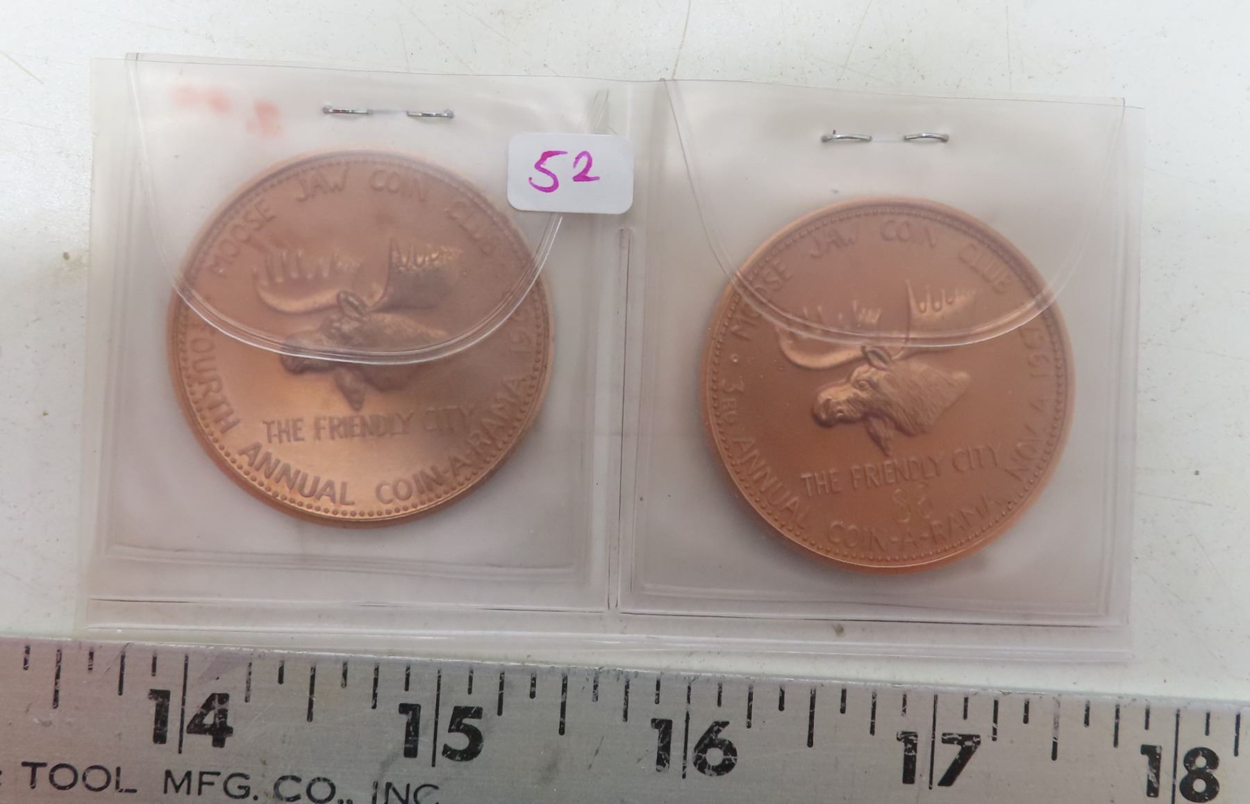Lot of 2 Moose Jaw Coin Club bronze medals. Includes 1967 3rd Annual Coin-a-Rama that celebrates the Centennial of Canada as well as 1968 4th Annual Coin-a-Rama that celebrates the airbase at Moose Jaw. BU Red.