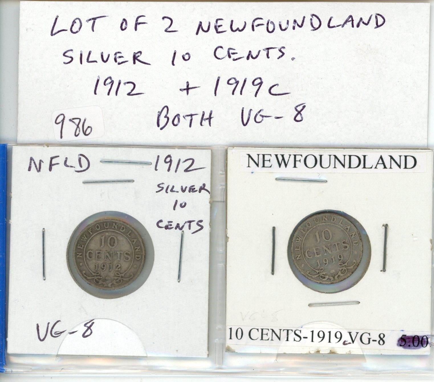 Lot of 2 Newfoundland Silver 10 cents. 1912 and 1919c. Both VG-8.