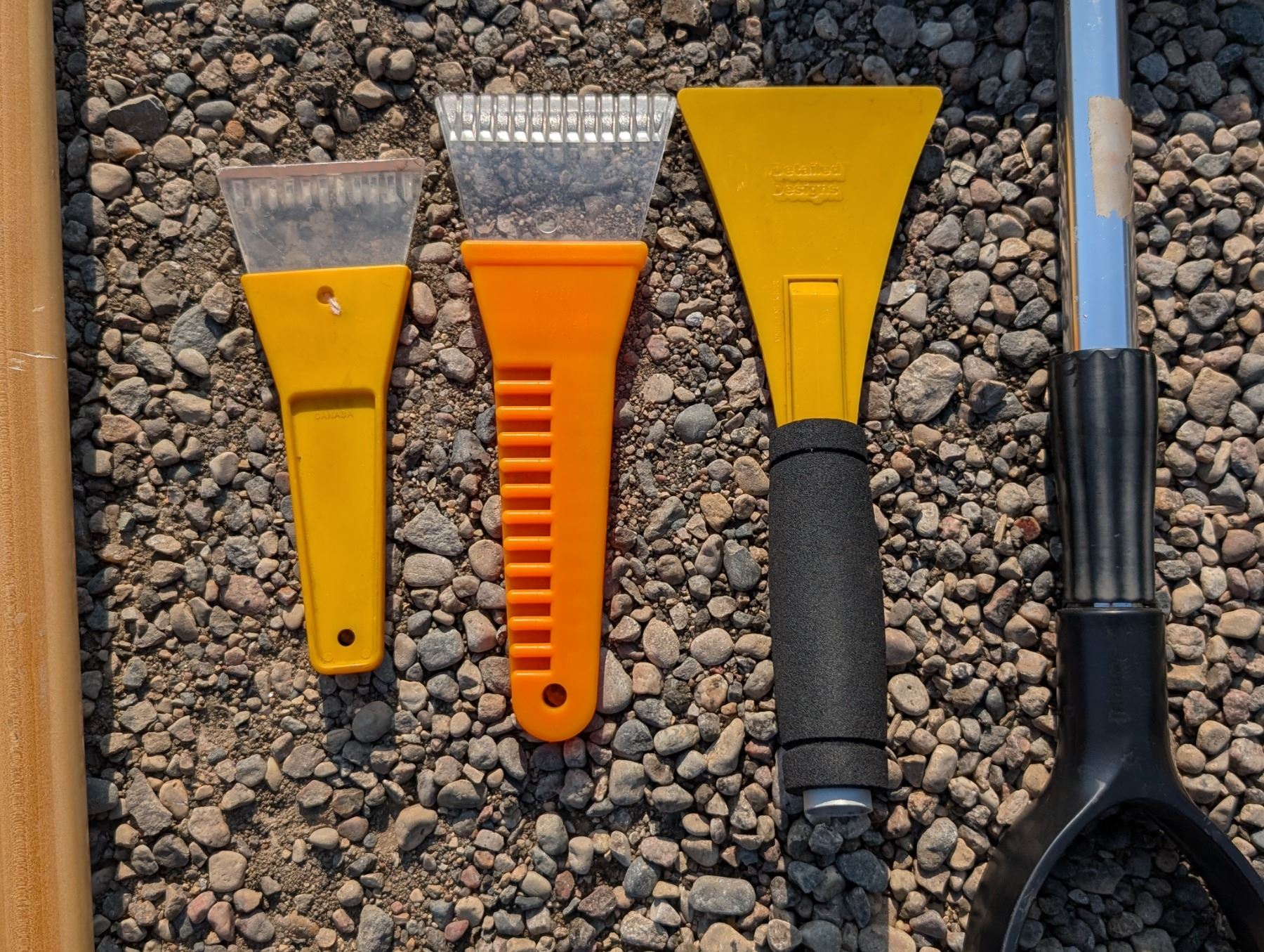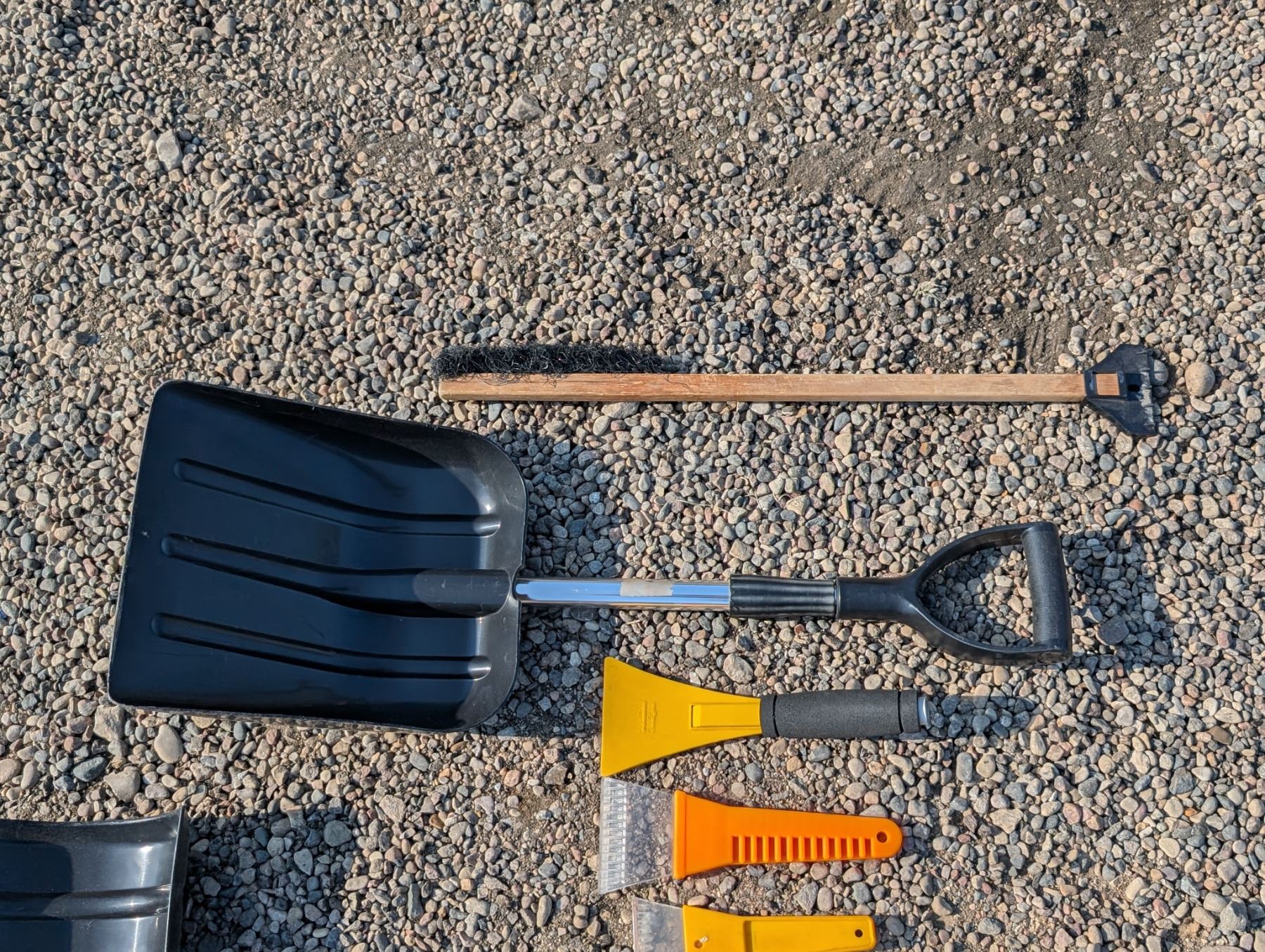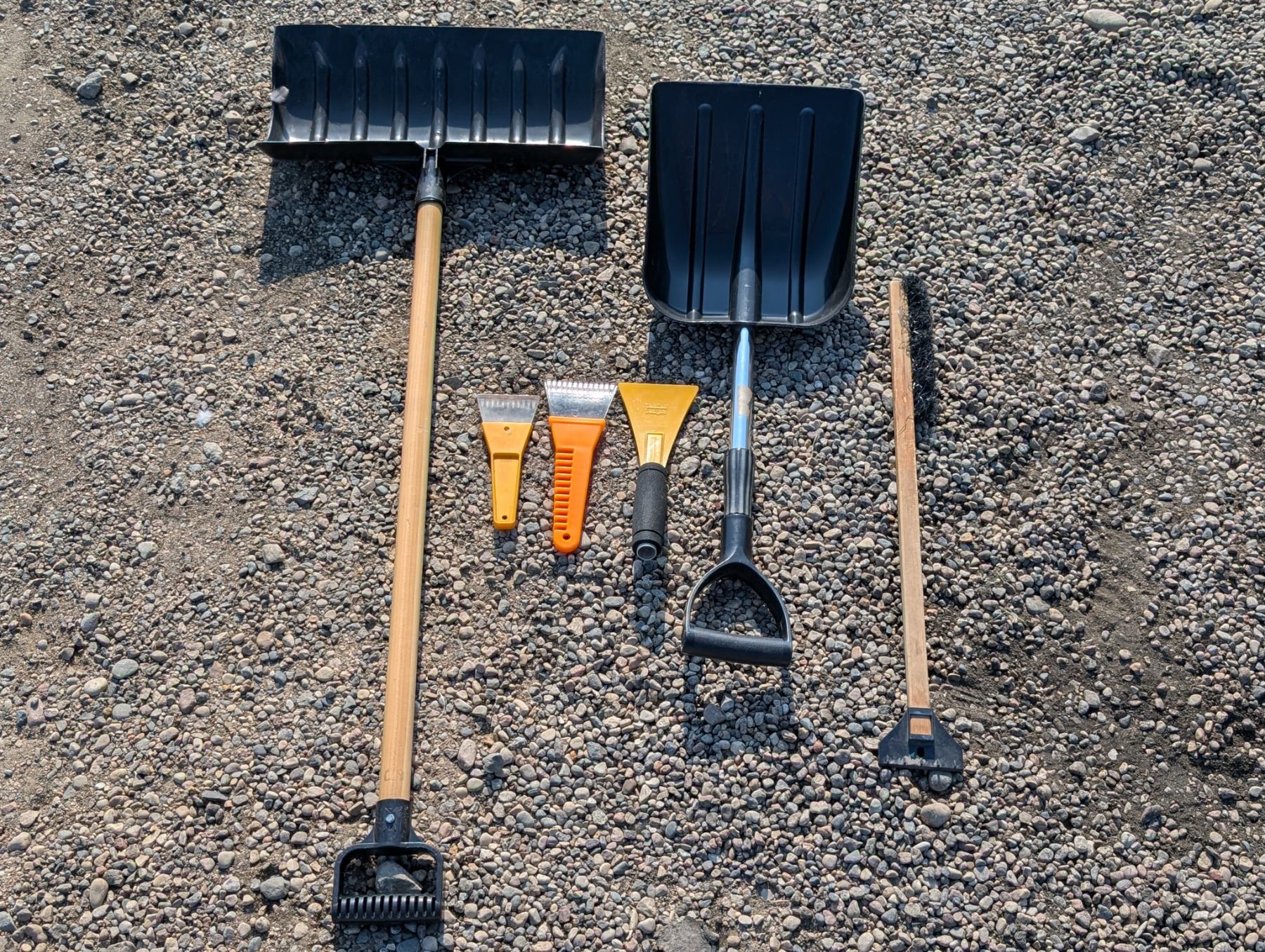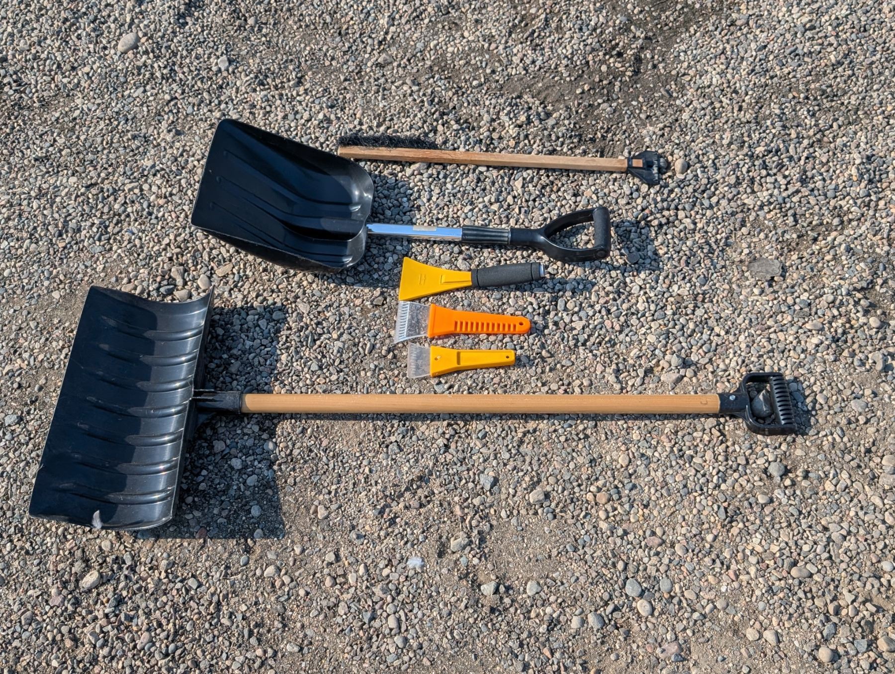 Lot of (2) Snow Shovels, Ice Scrapers, and Wooden Snow Brush