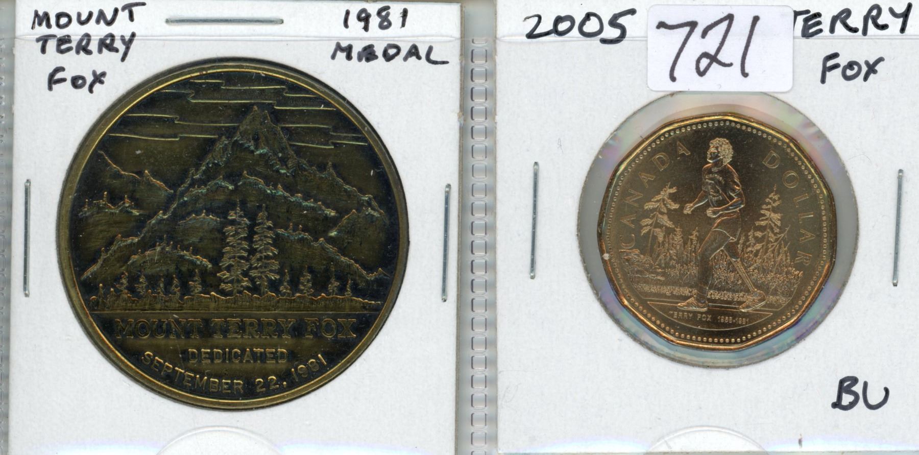 Lot of 2 Terry Fox. Includes 1981 Mount Terry Fox Dedication Medal & 2005 Terry Fox Loonie.