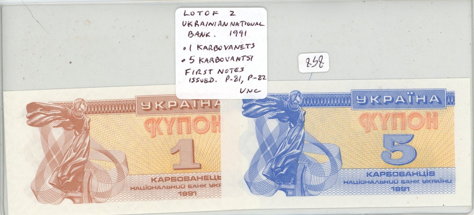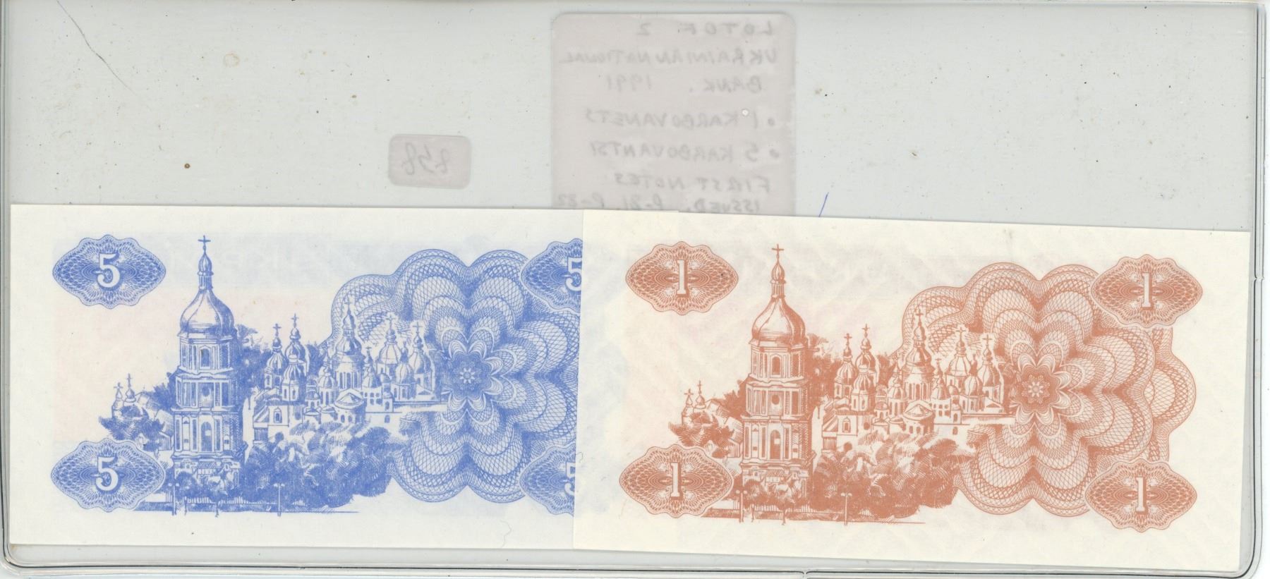 Lot of 2 Ukrainian National Bank notes. 1991 1 Karbovanets & 5 Karbovantsi. First notes issued by the new Republic. P-81, P-82. Unc.