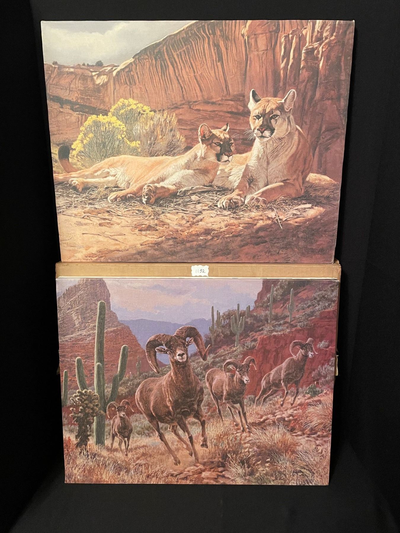 Lot of 2 Vintage Canvas Paintings w Original Packaging. Mountain Lion/Bighorn Sheep.16"highx 20" wide.