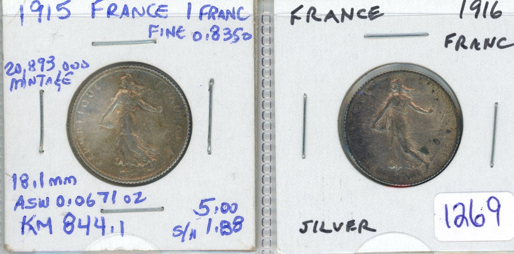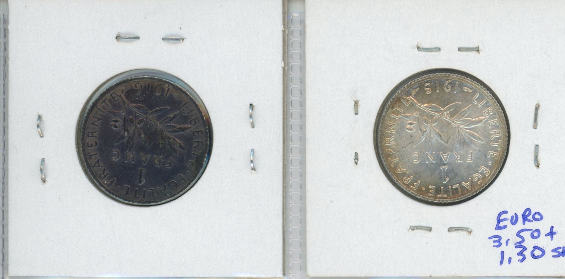 Lot of 2 World War I France Silver Francs. Includes 1915 & 1916. Both coins grade AU-50.