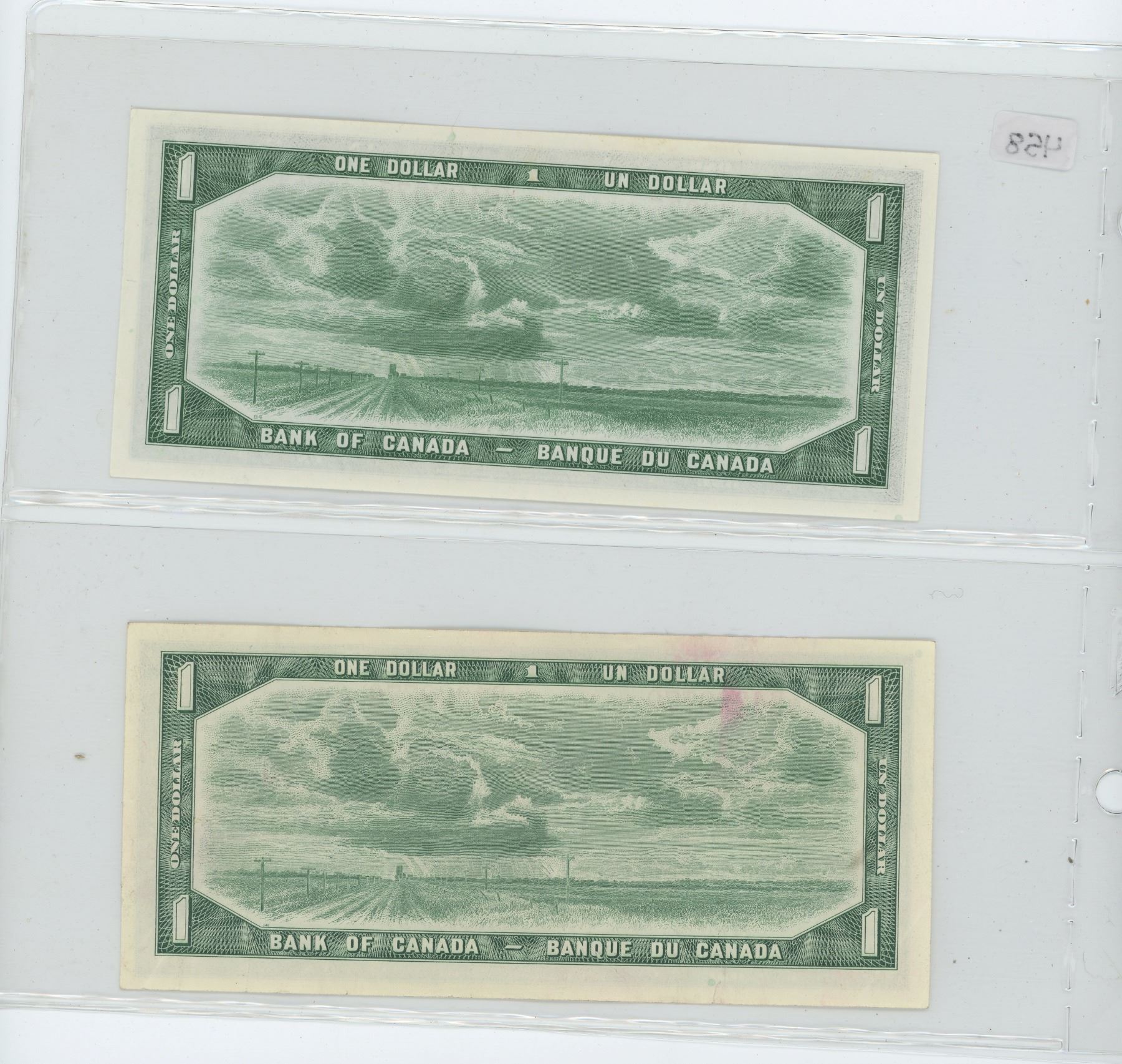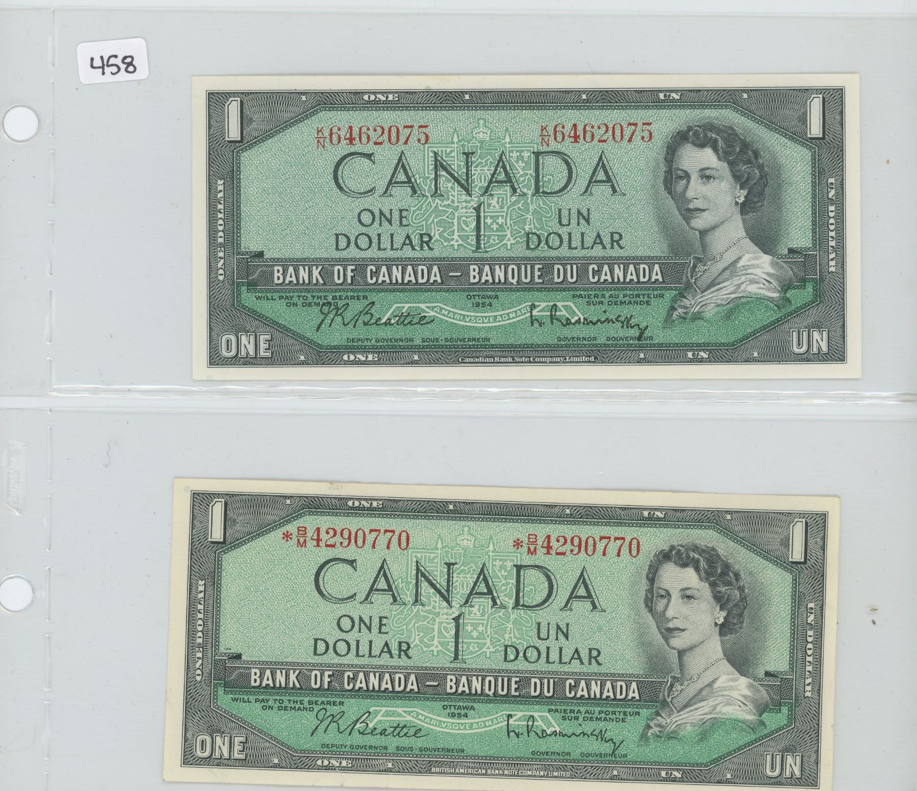 Lot of 2 different 1954 Modified Portrait $1 notes. Both with Beattie-Rasminsky signatures, but one has a K/N prefix while the other is a Replacement note *B/M. Uncirculated and VF-30.
