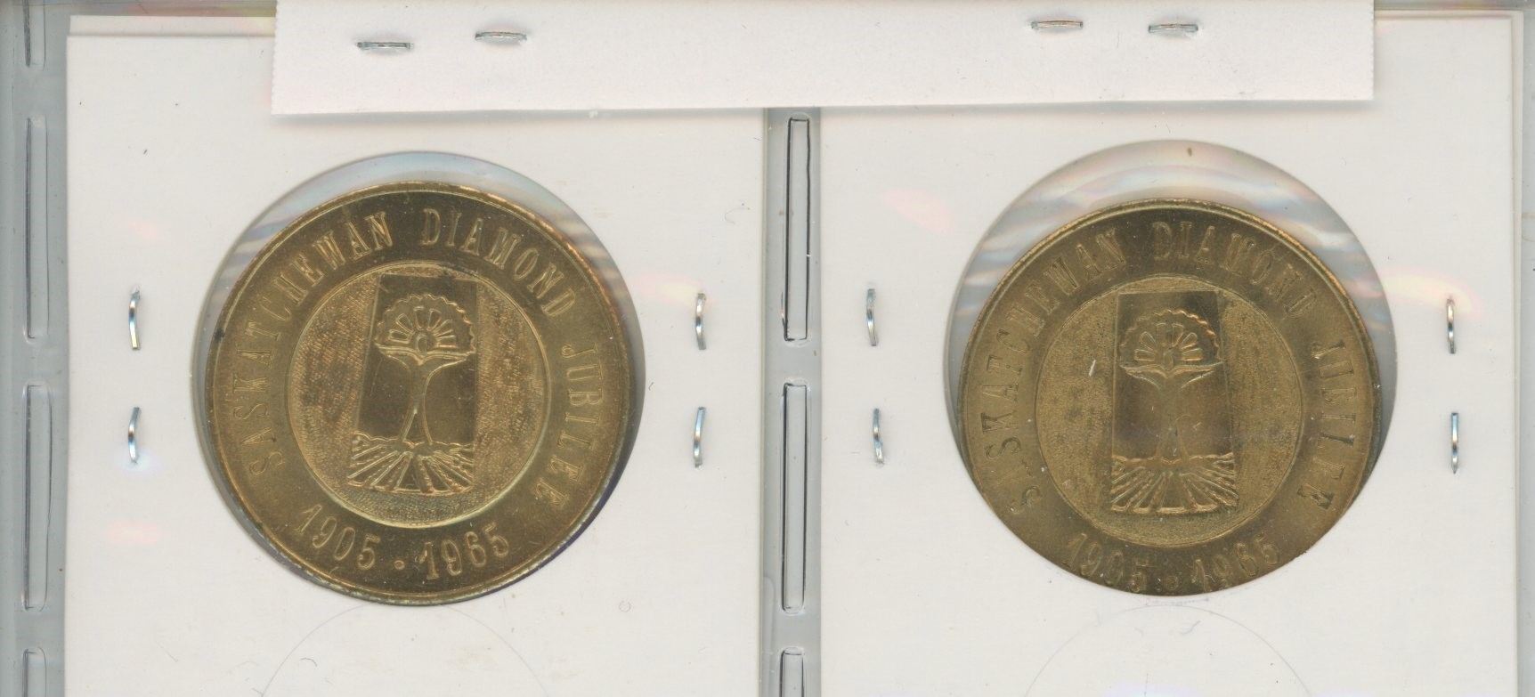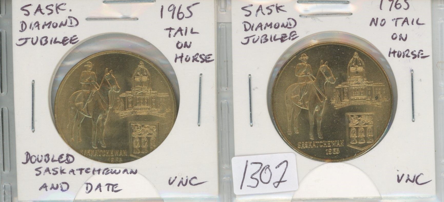 Lot of 2 different 1965 Saskatchewan Diamond Jubilee Medals Varieties: Scarce Tail on Horse with Doubled SASKATCHEWAN & 1965 and Normal No Tail on Horse. All Unc. Nice.